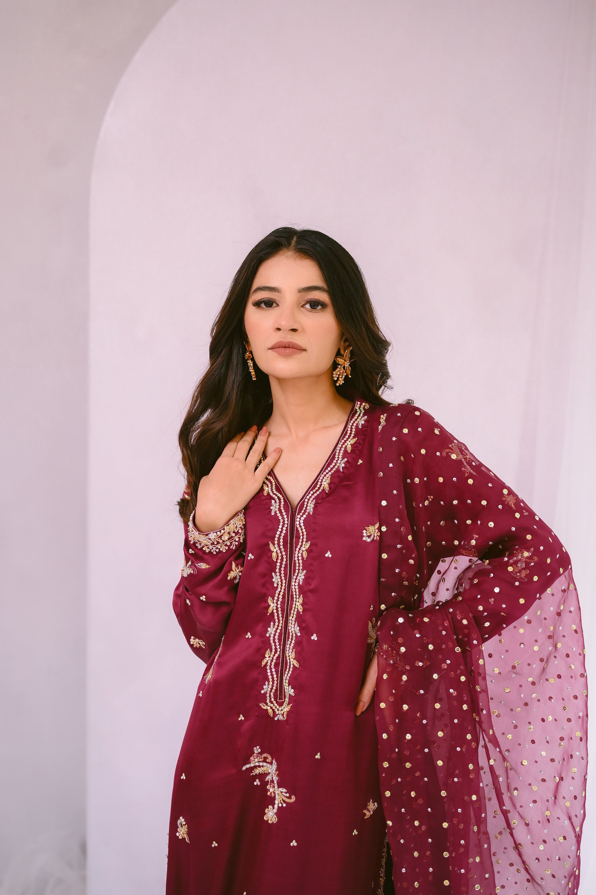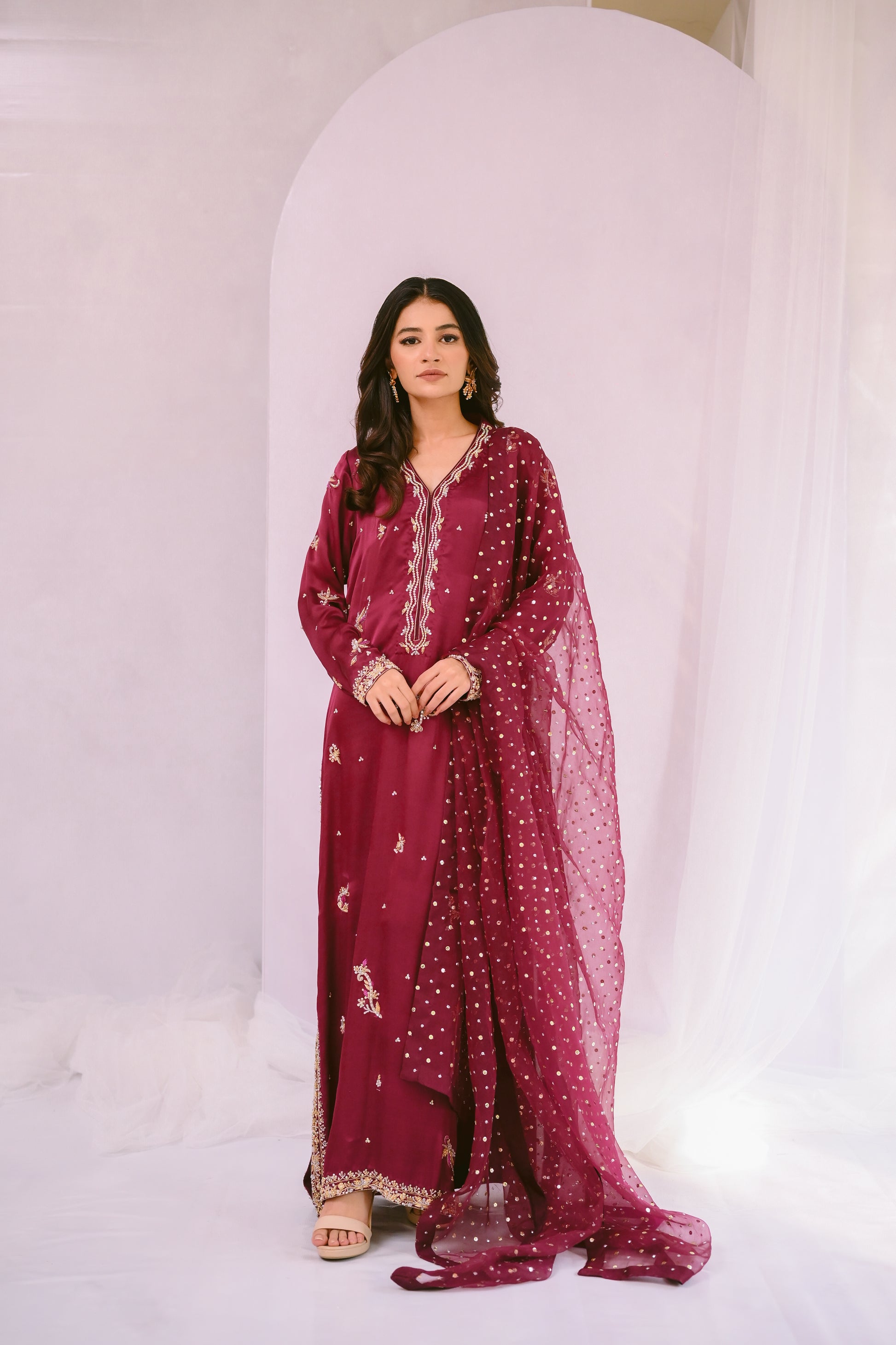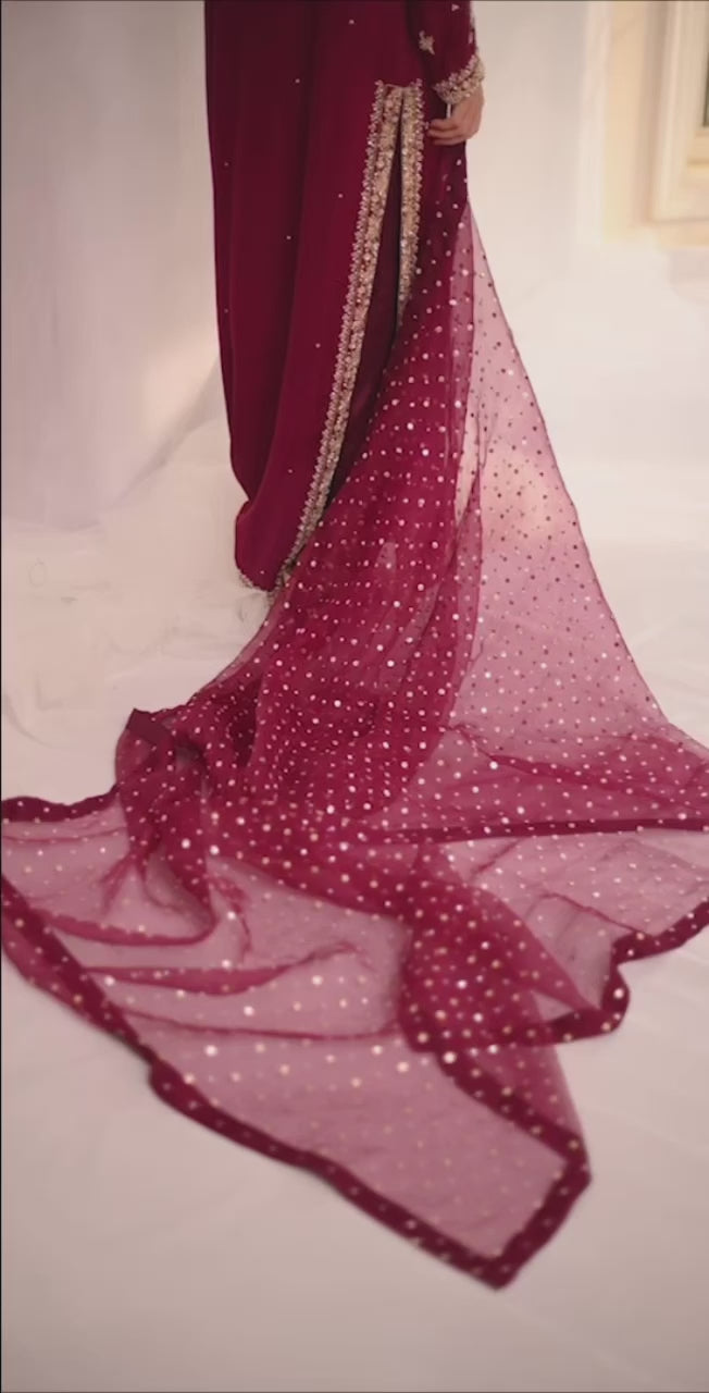 Discover luxury with our magenta Pure Sharmose Silk Shirt, featuring elaborate borders and motifs. Paired with a pure organza dupatta embellished with sequins and Chan work, this ensemble exudes timeless elegance and grandeur