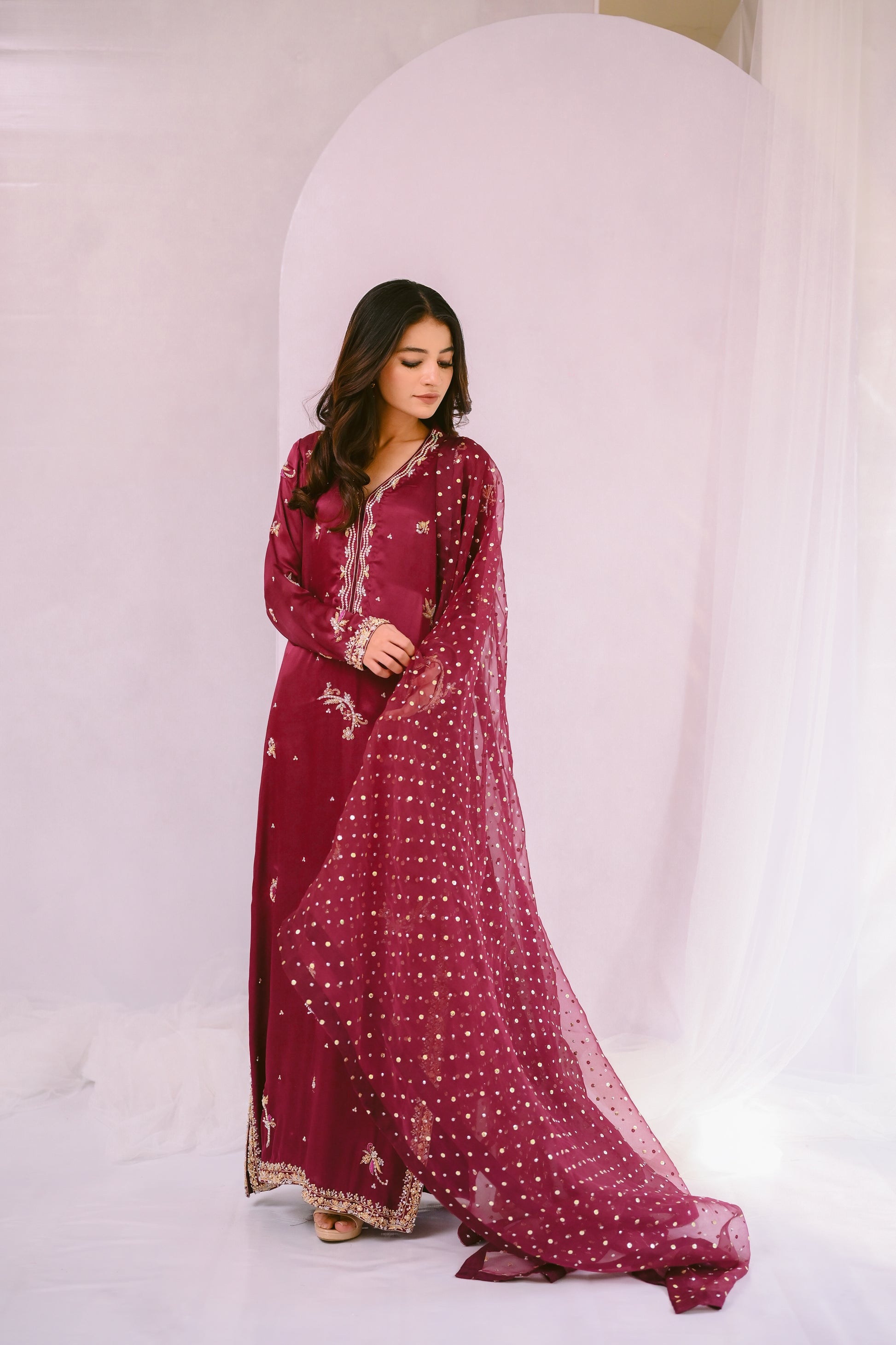 The outfit will be delivered in 5-6 weeks. For urgent delivery you can send us a request via email or WhatsApp. All purchases are non-refundable; there is no provision for returns if the product matches the picture.