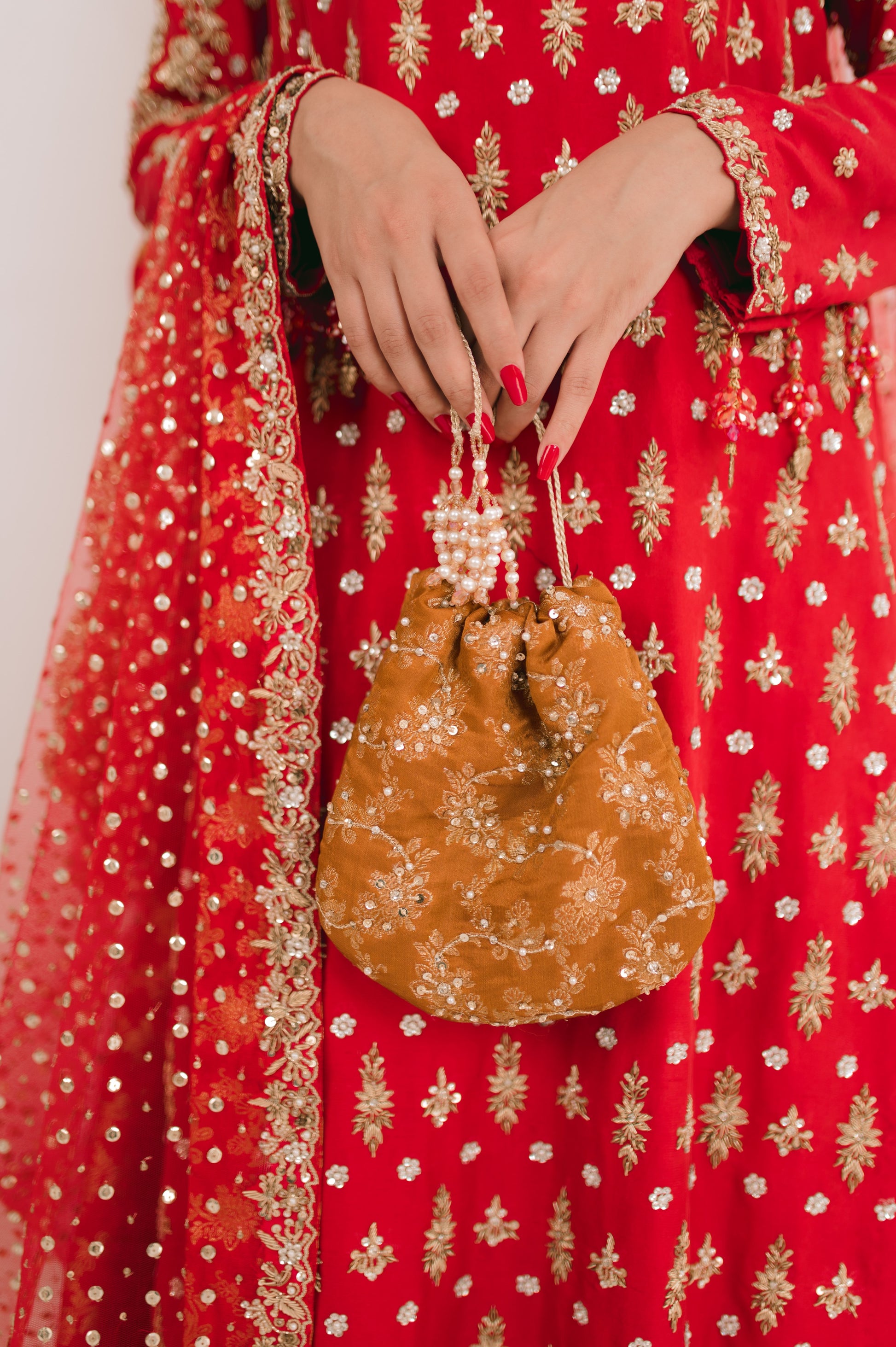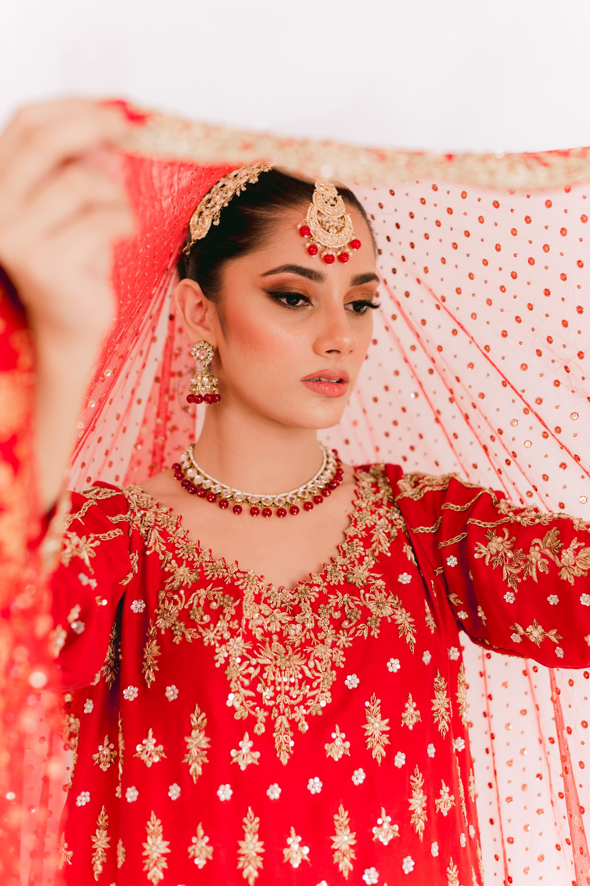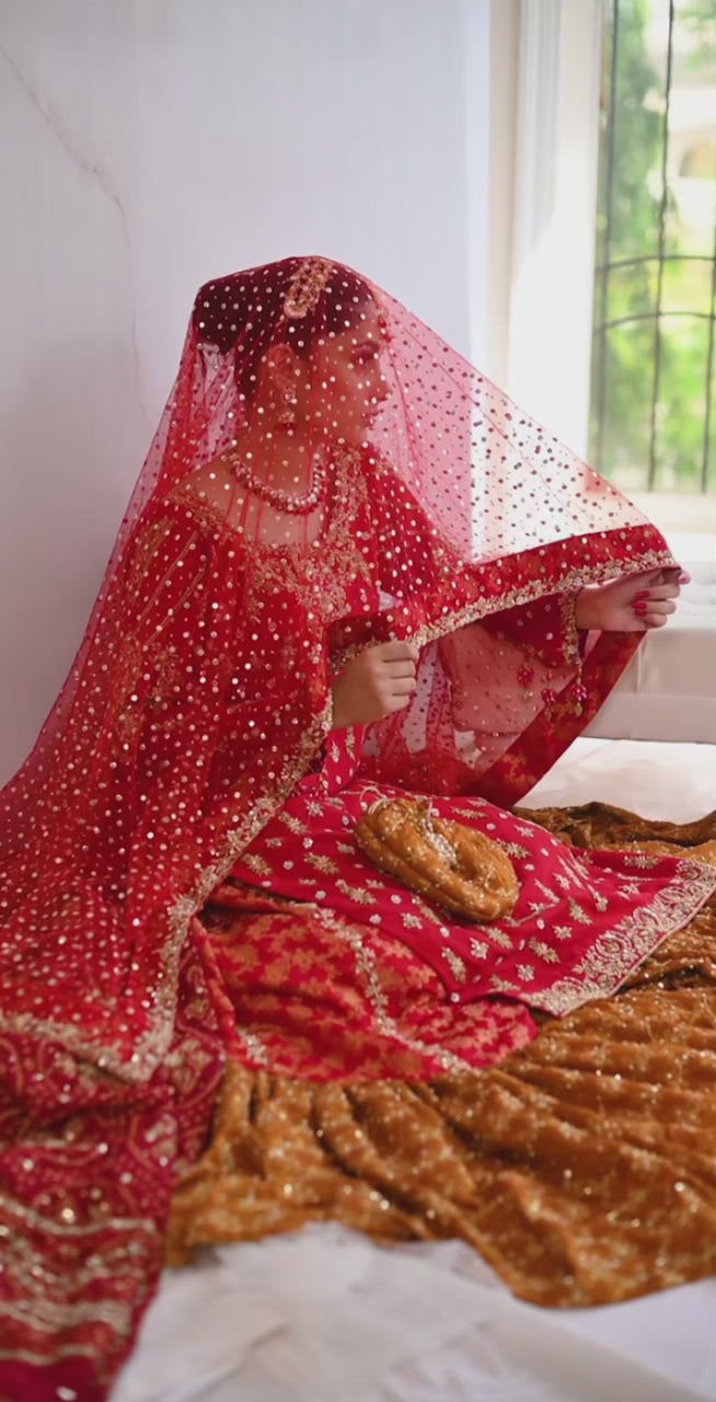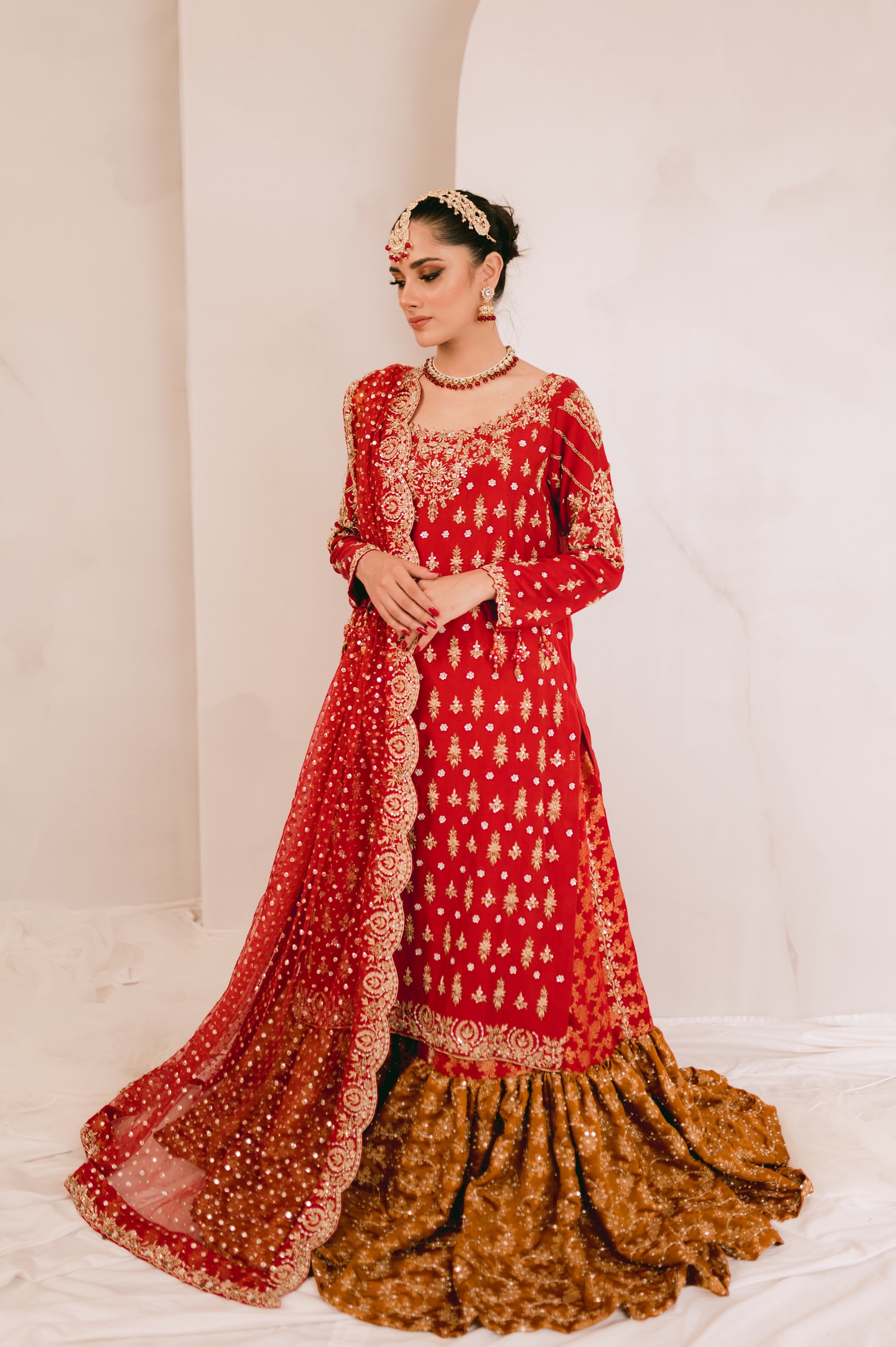 This stunning bridal ensemble features a vibrant red pure raw silk shirt, adorned with exquisite zardozi work on the front and sleeves. The intricate detailing adds depth and opulence to the overall design, making it a perfect choice for a special occasion. The shirt is beautifully paired with a complementary red and rust gharara, creating a harmonious blend of colors. The gharara adds an element of grace and elegance, while the intricate zardozi borders on the red net dupatta further enhance its beauty. The heavy zardozi borders on the dupatta add a touch of regal charm, completing the ensemble with a royal flair. This captivating outfit embodies traditional aesthetics with a contemporary twist, making it a standout choice for any bride.