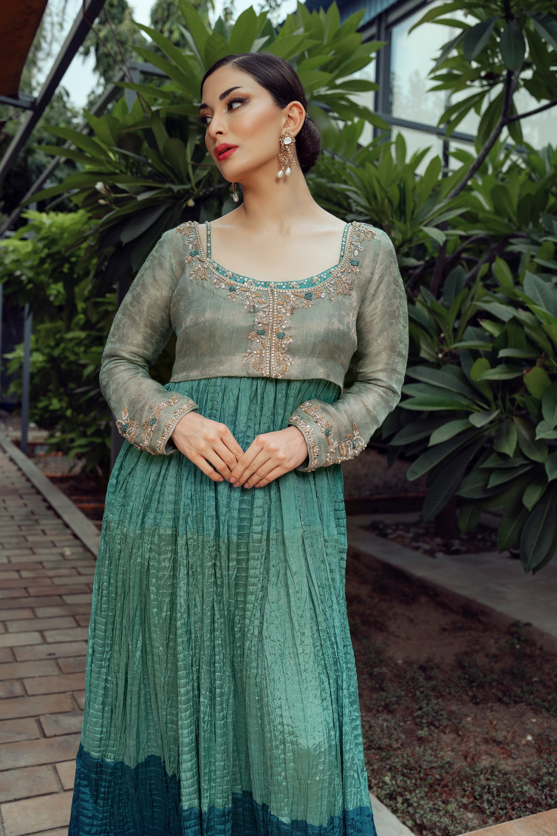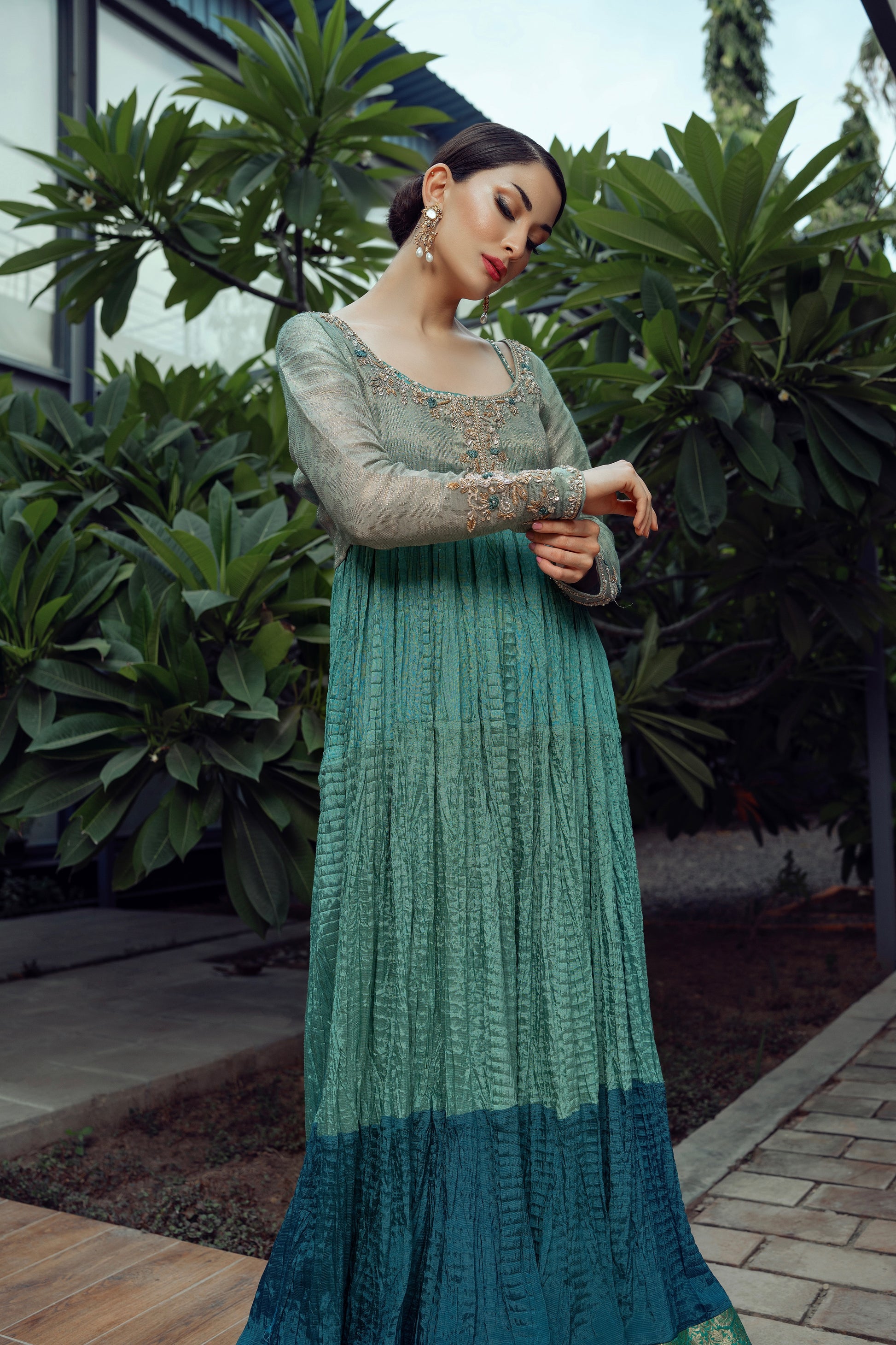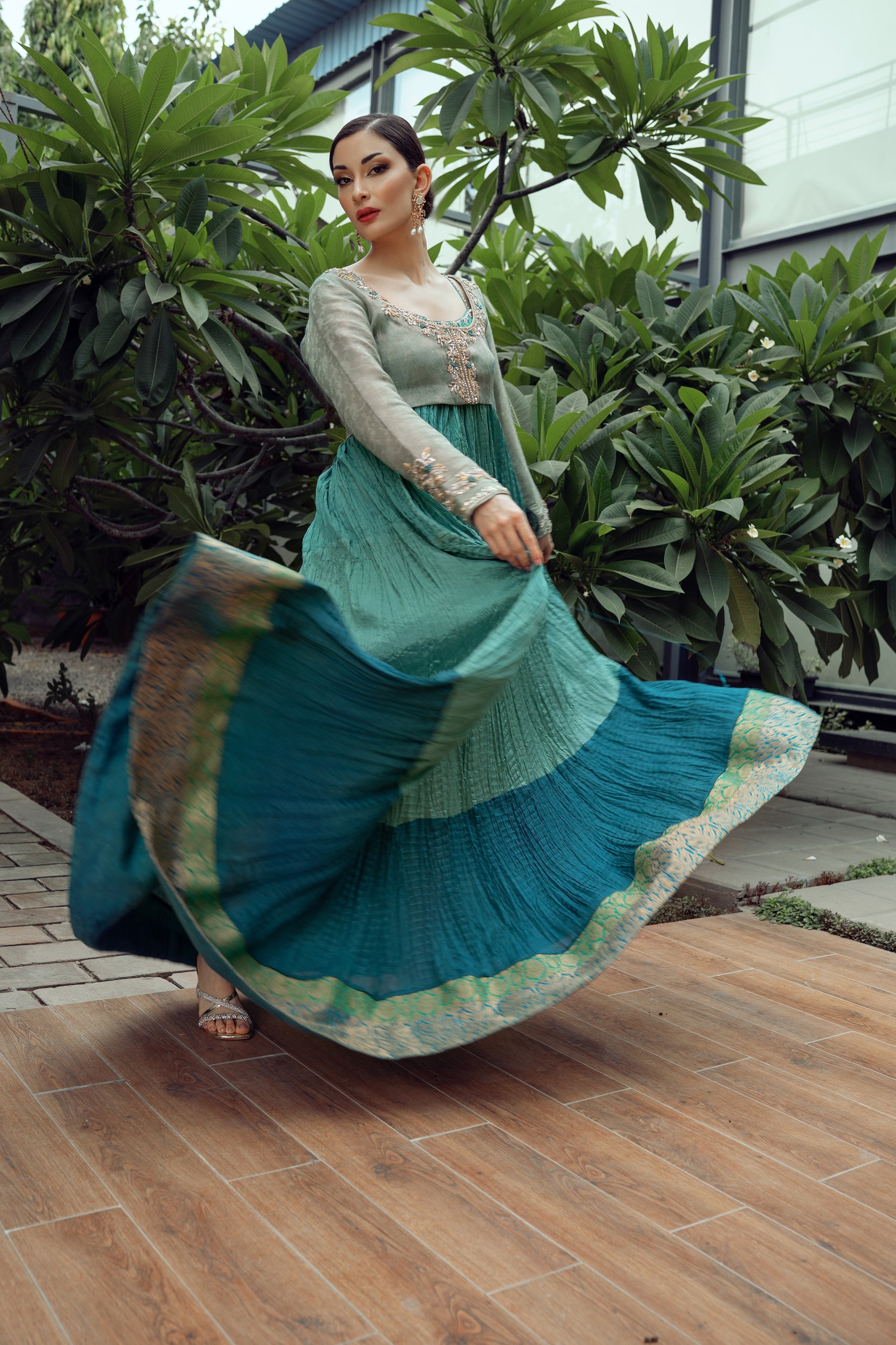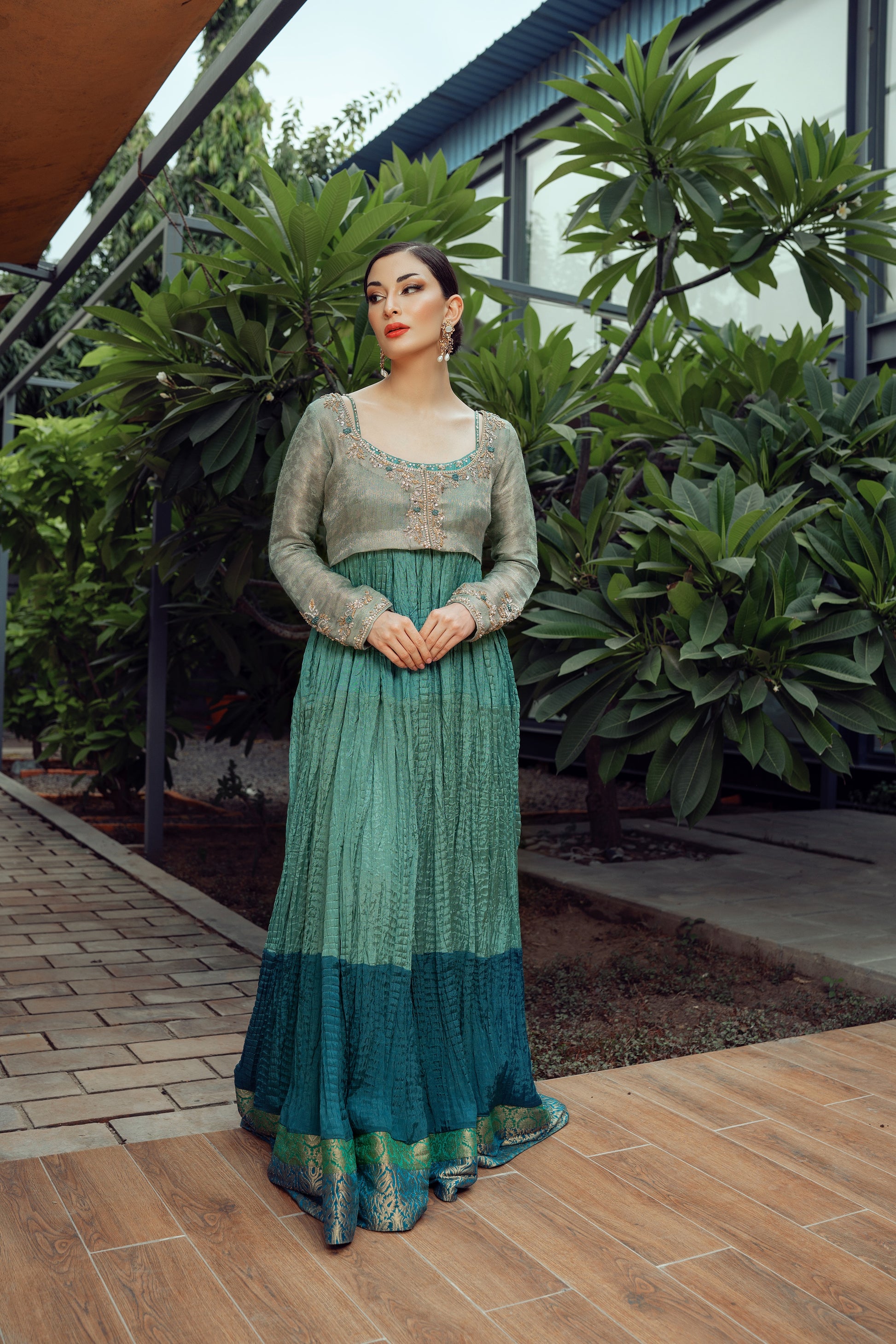 Seagreen and Teal 3 Tone Crushed Flair with Banarsi Borders paired with a gorgeously shaded Seagreen net dupatta adorned with sequins chan. This exquisite ensemble showcases a perfect blend of elegance and style. The pure Maisoori choli features intricate handwork, adding a touch of luxurious appeal. Whether it's a wedding ceremony or a festive occasion, this outfit is a statement piece that will leave you feeling like a true diva. Embrace the grace of this ensemble and make heads turn wherever you go.
