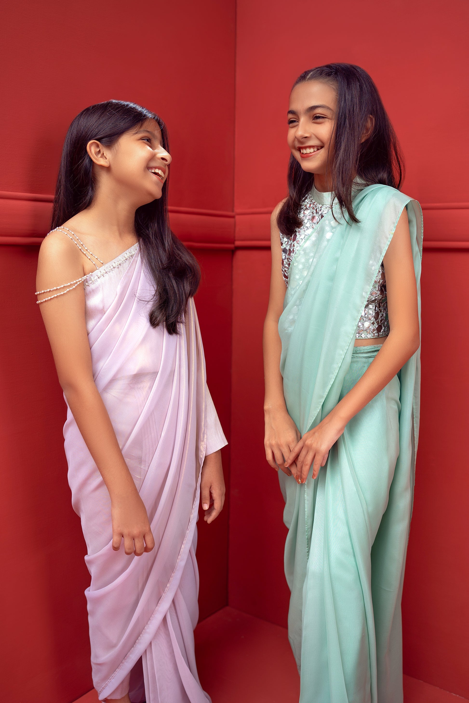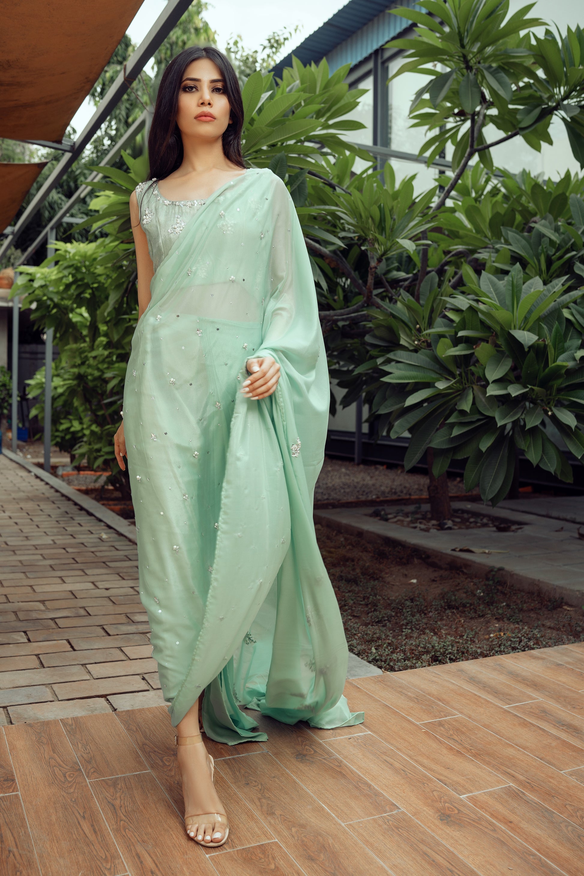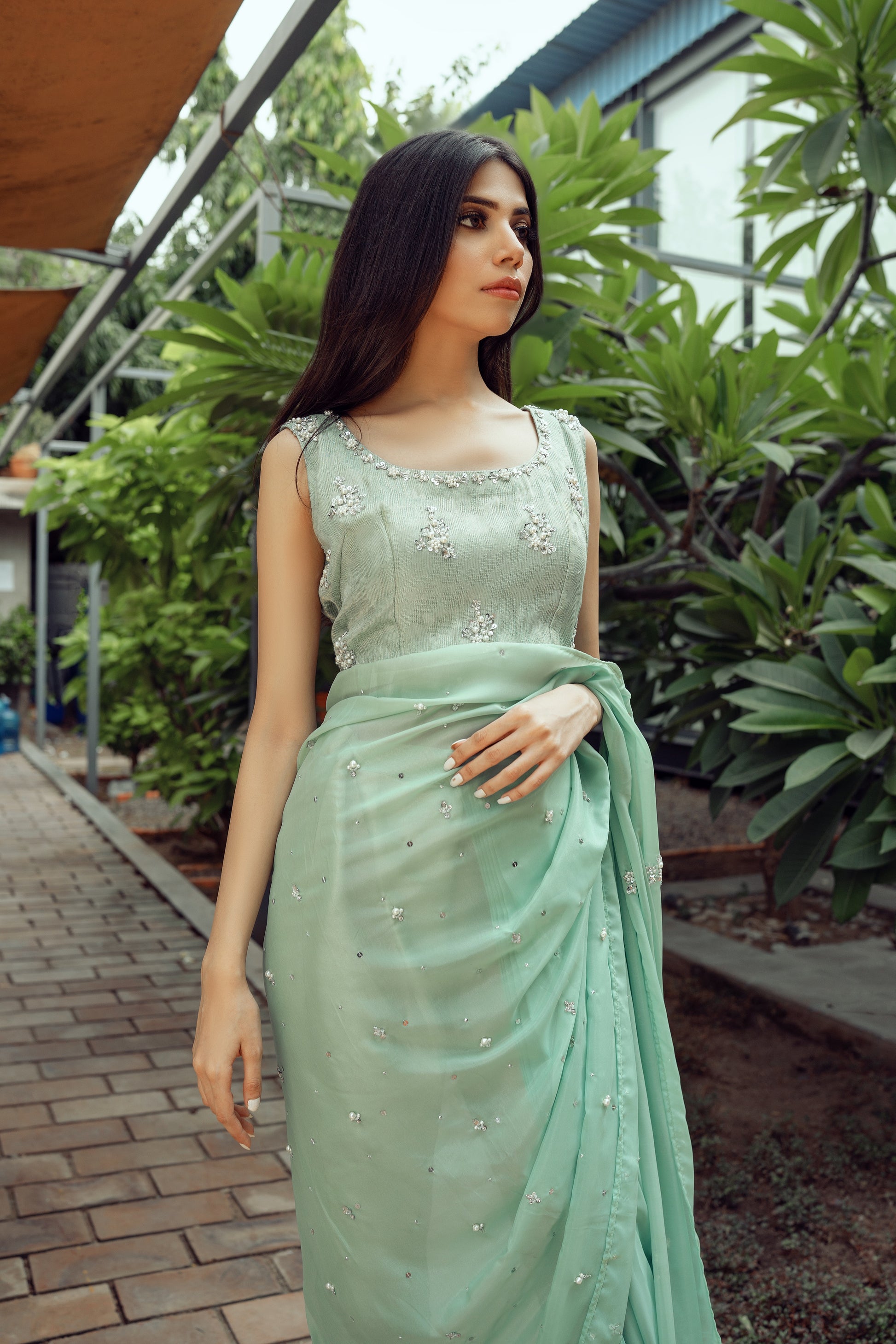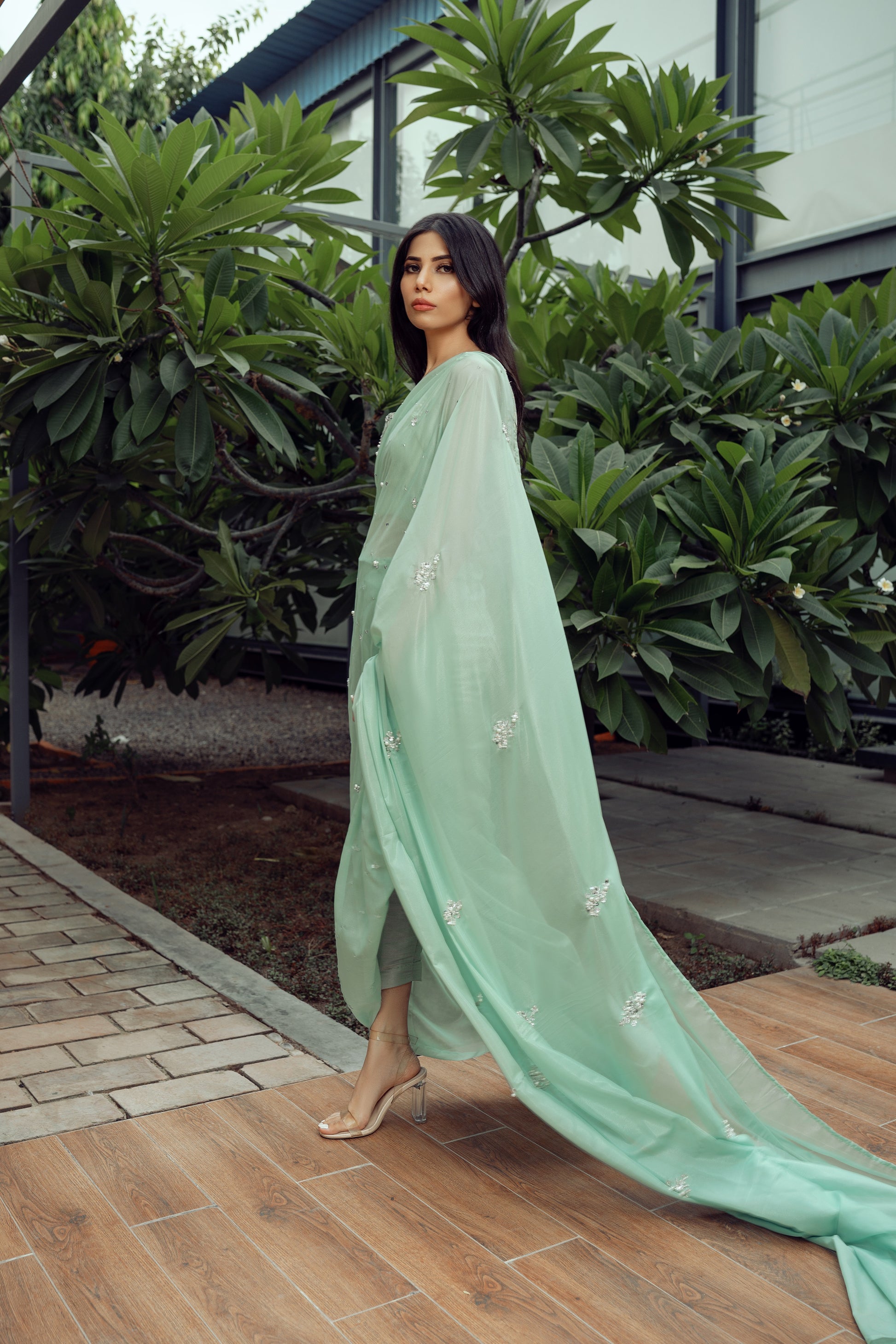 Seagreen Gorgette Saari Pants, Crafted with exquisite attention to detail, these pants feature stunning handwork motifs embellished with stones, sequins, and dabka embroidery, creating a captivating design. The accompanying Maisoori blouse perfectly complements the saari pants, showcasing motifs all over the fabric. The elegant Banarsi pants complete this ensemble, adding a touch of sheer sophistication. Indulge in the beauty and craftsmanship of this ensemble, perfect for any special occasion or celebration.