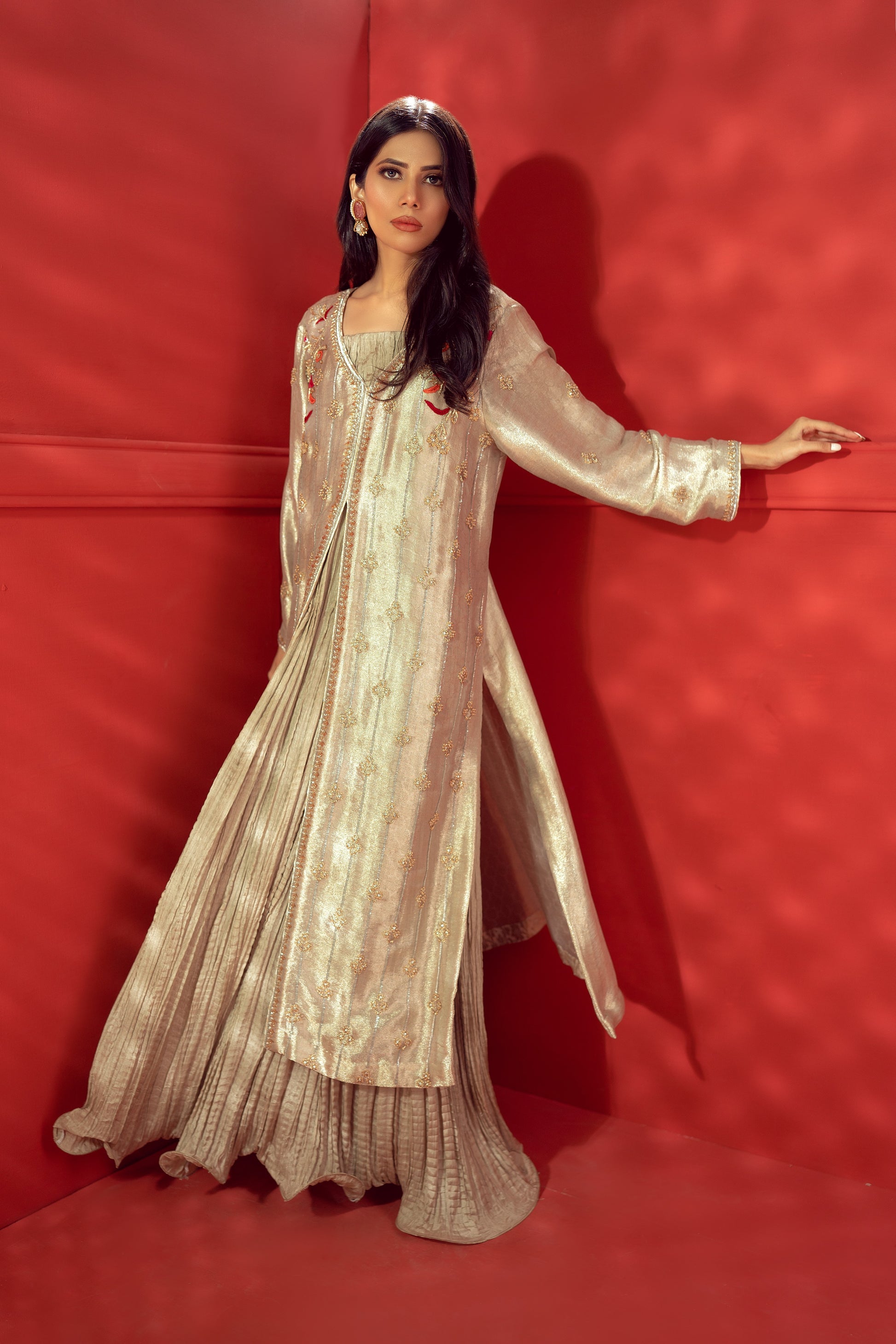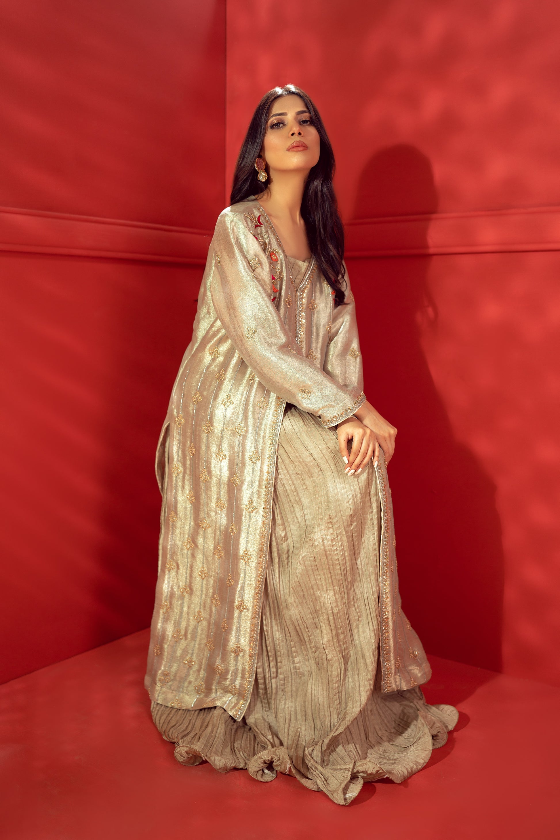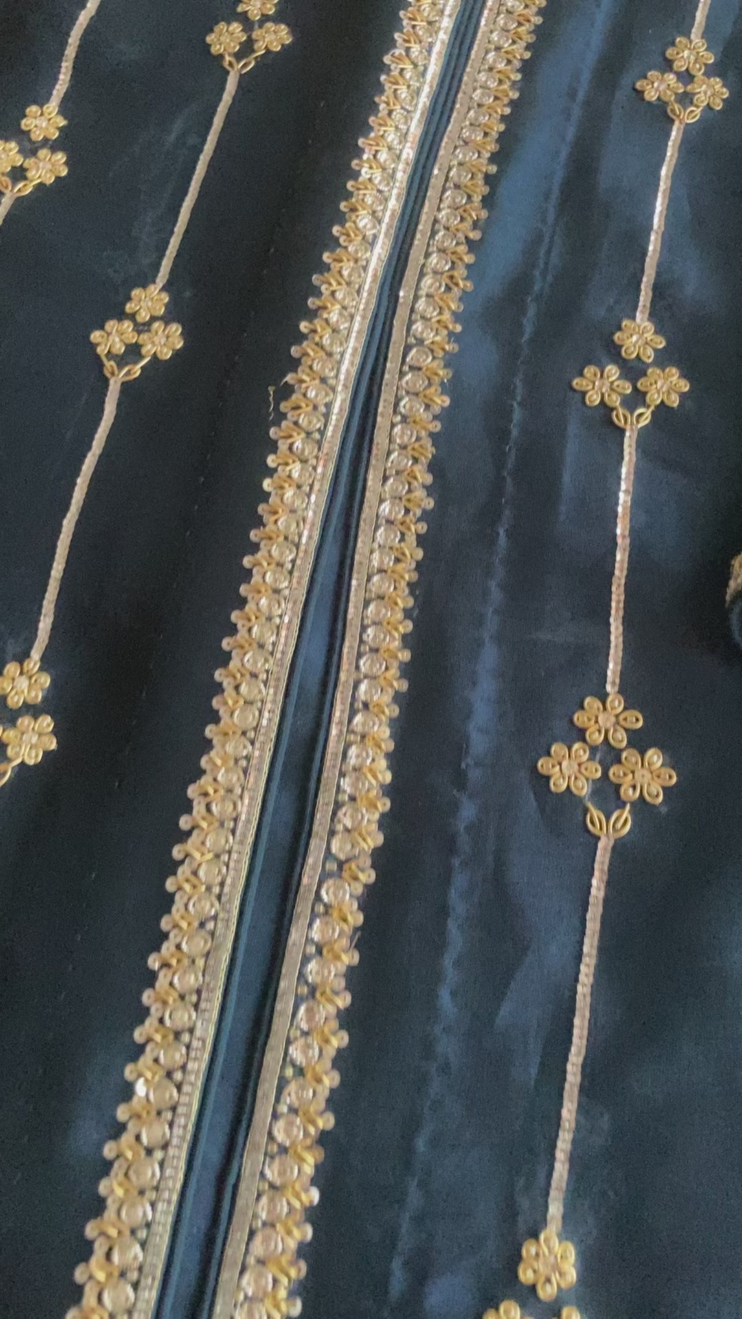 Gold Tissue Maisoori Front Open Straight Shirt with silk crushed inner, a true embodiment of elegance and charm. Handcrafted with intricate details, this piece features delicate handwork that adds a touch of sophistication. Paired with a pure organza dupatta adorned with sequins chan, this ensemble is a timeless choice for any special occasion. Available in stunning shades of teal, made with luxurious pure sheesha silk fabric, our collection offers a range of colors to suit your personal style. Set yourself apart with this striking outfit that combines traditional craftsmanship and contemporary design.
