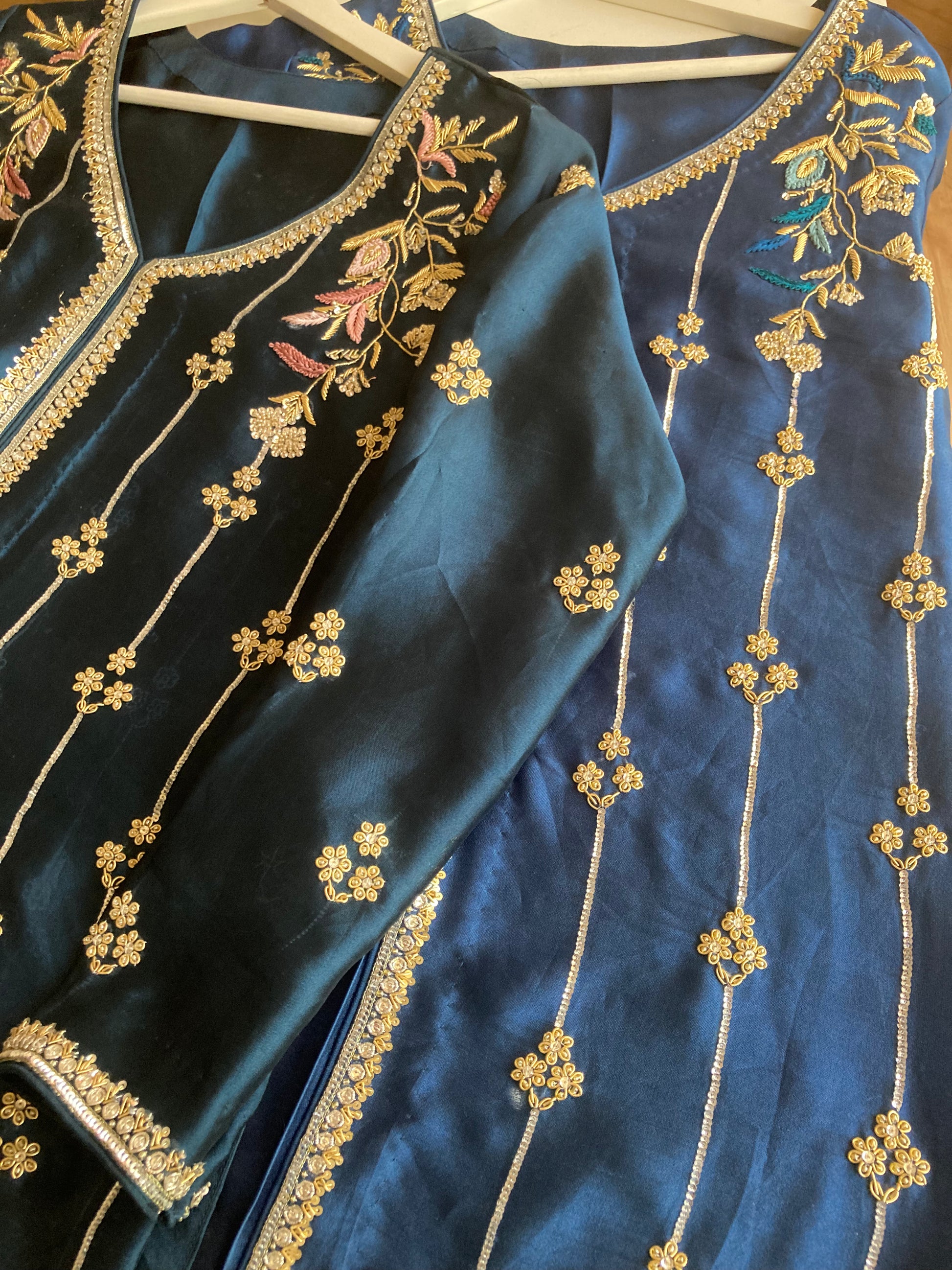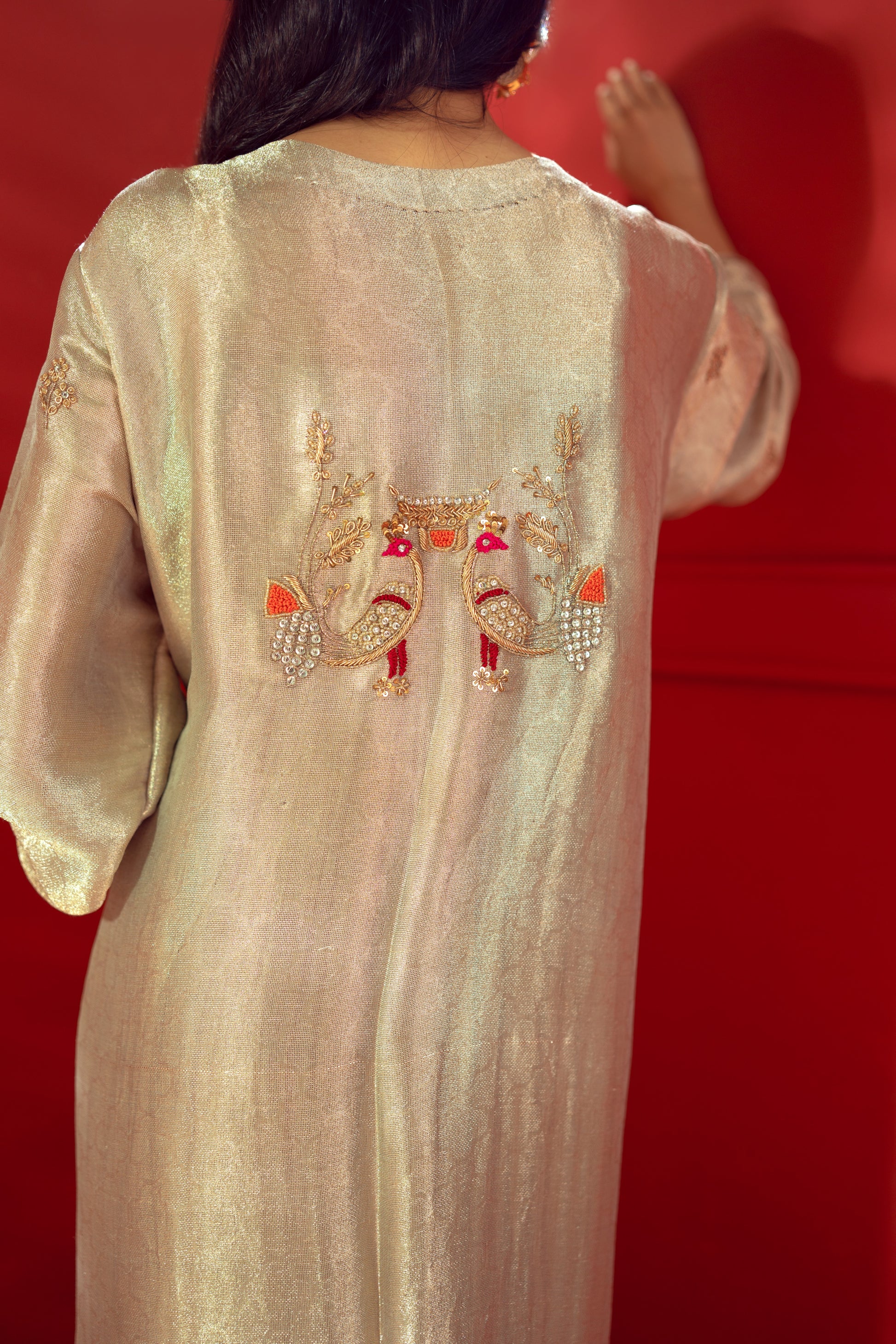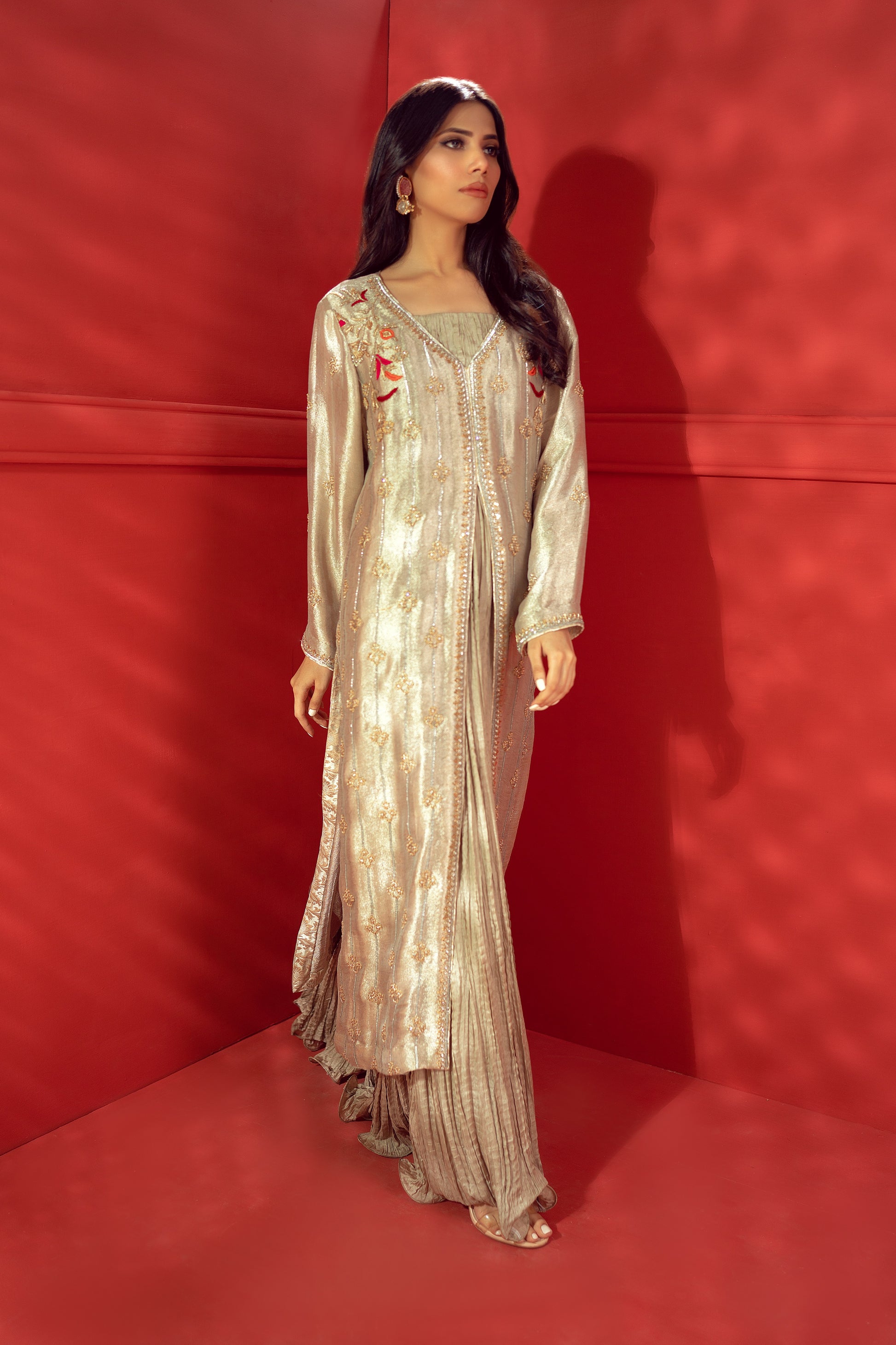 Gold Tissue Maisoori Front Open Straight Shirt with silk crushed inner, a true embodiment of elegance and charm. Handcrafted with intricate details, this piece features delicate handwork that adds a touch of sophistication. Paired with a pure organza dupatta adorned with sequins chan, this ensemble is a timeless choice for any special occasion. Available in stunning shades of teal, made with luxurious pure sheesha silk fabric, our collection offers a range of colors to suit your personal style. Set yourself apart with this striking outfit that combines traditional craftsmanship and contemporary design.