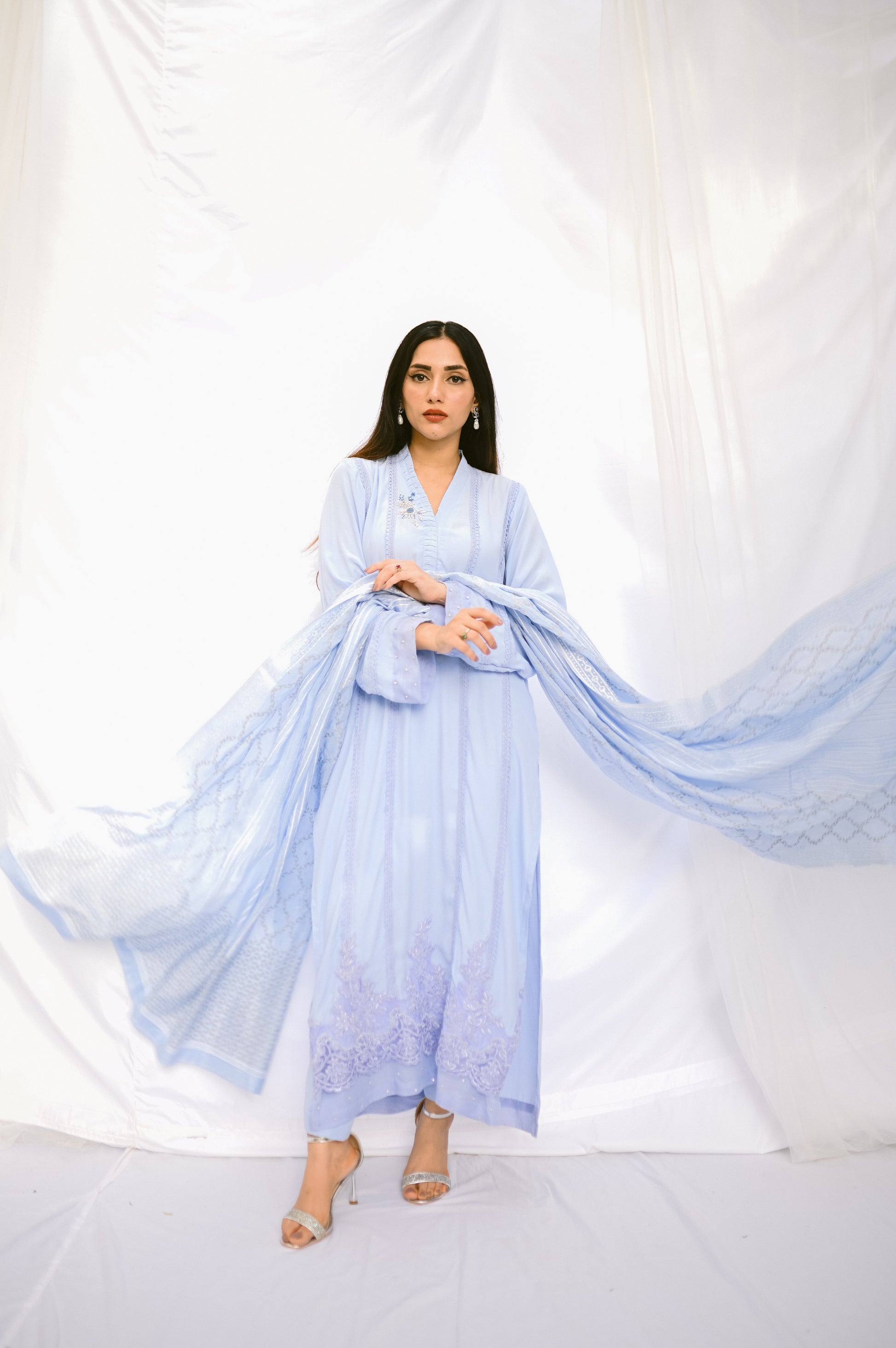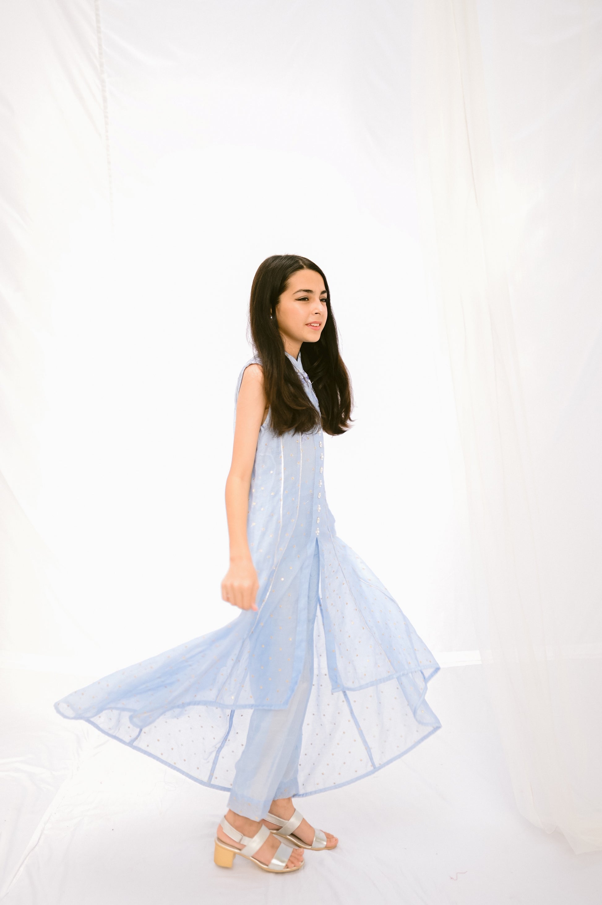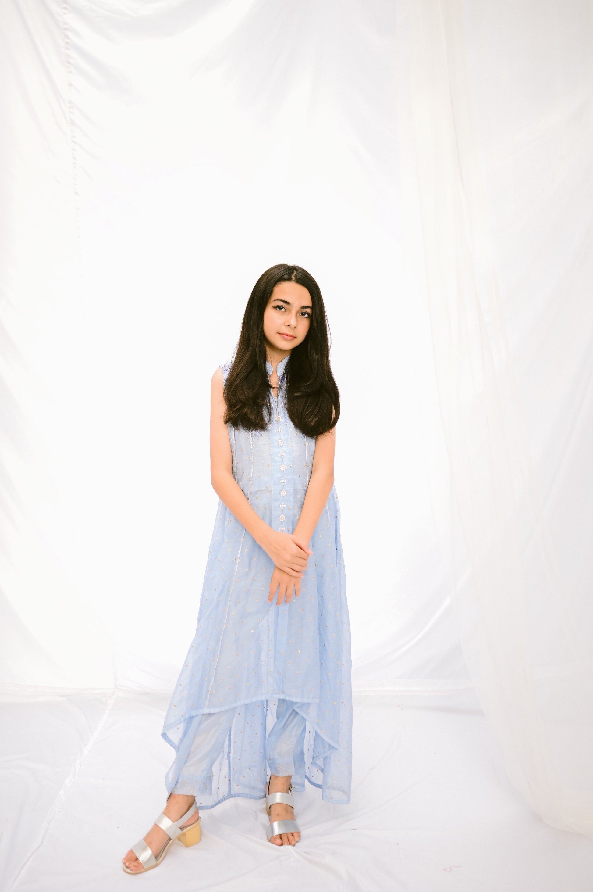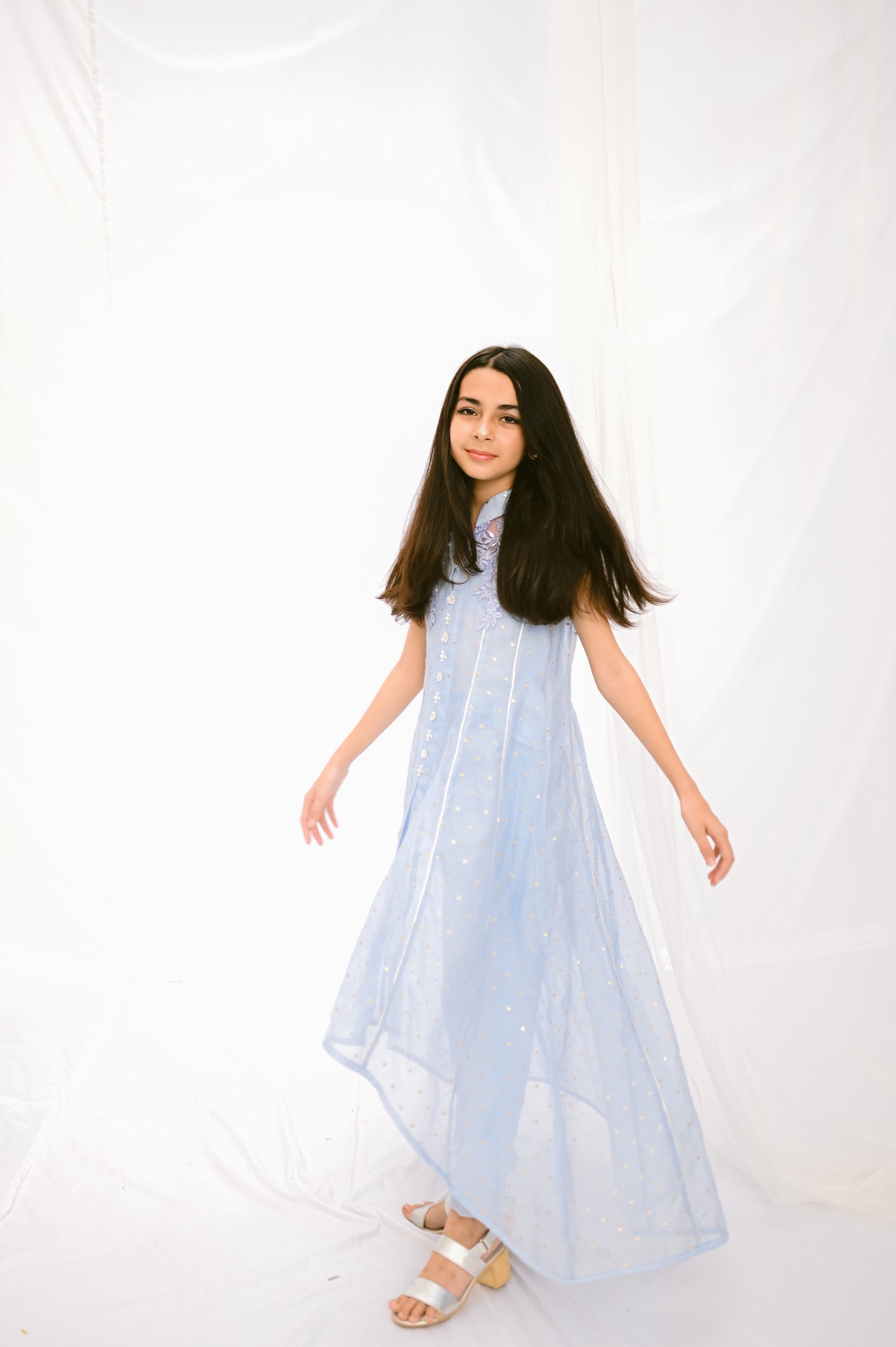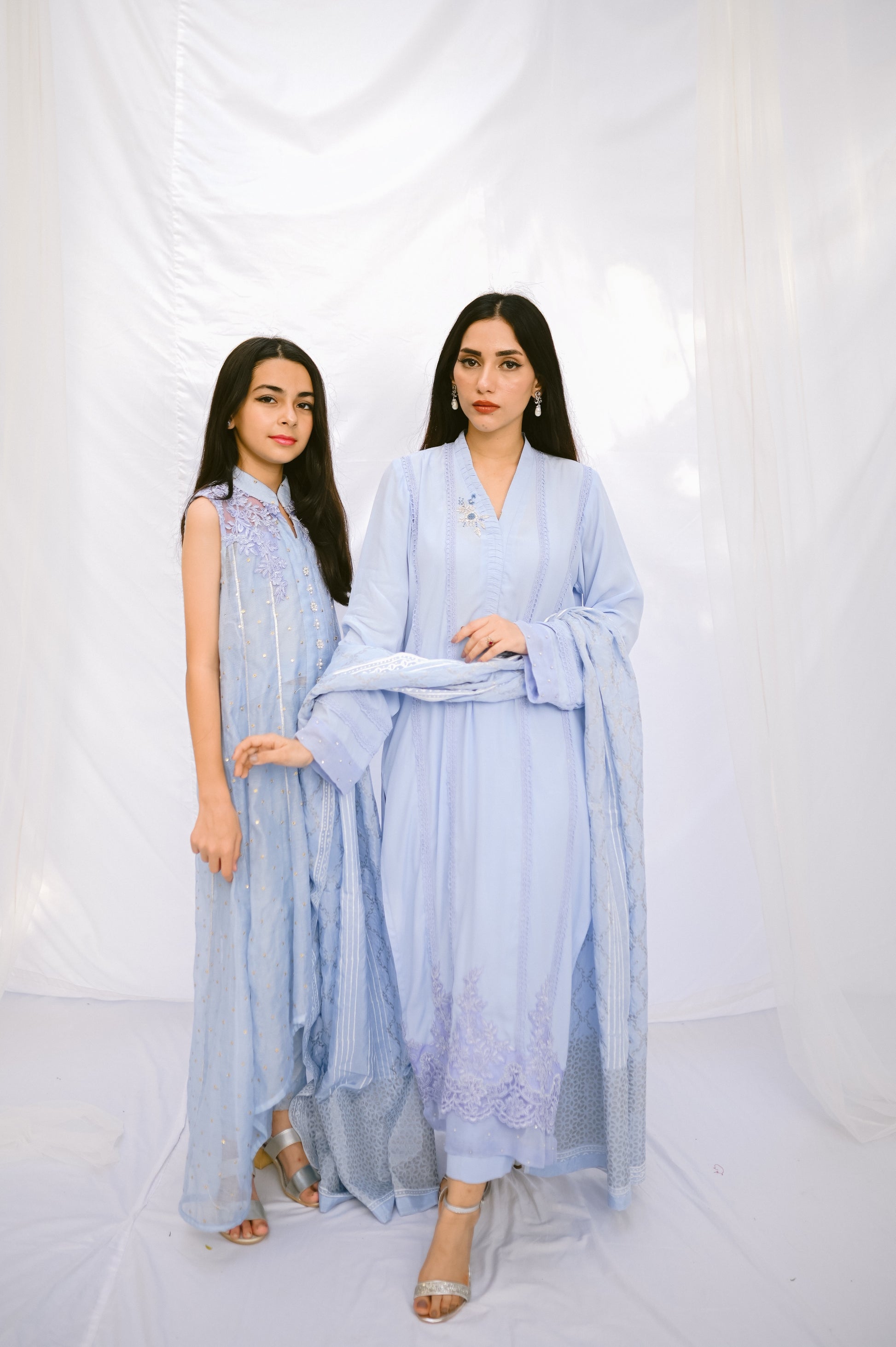 Add a touch of elegance to your wardrobe with our blue crepe gorgette long shirt embellished with intricate laces and hand embroidered motifs on the neckline. Paired with a stunning block printed dupatta, this outfit is perfect for any occasion. Don't forget to check out our matching mother-daughter set featuring a beautiful cotton net front open flair with separate inner and pants for your little one!