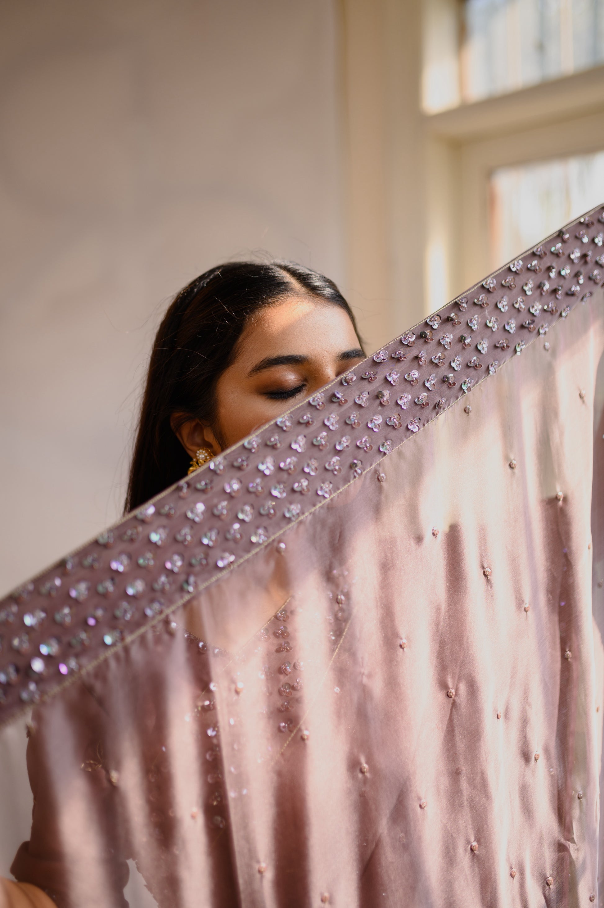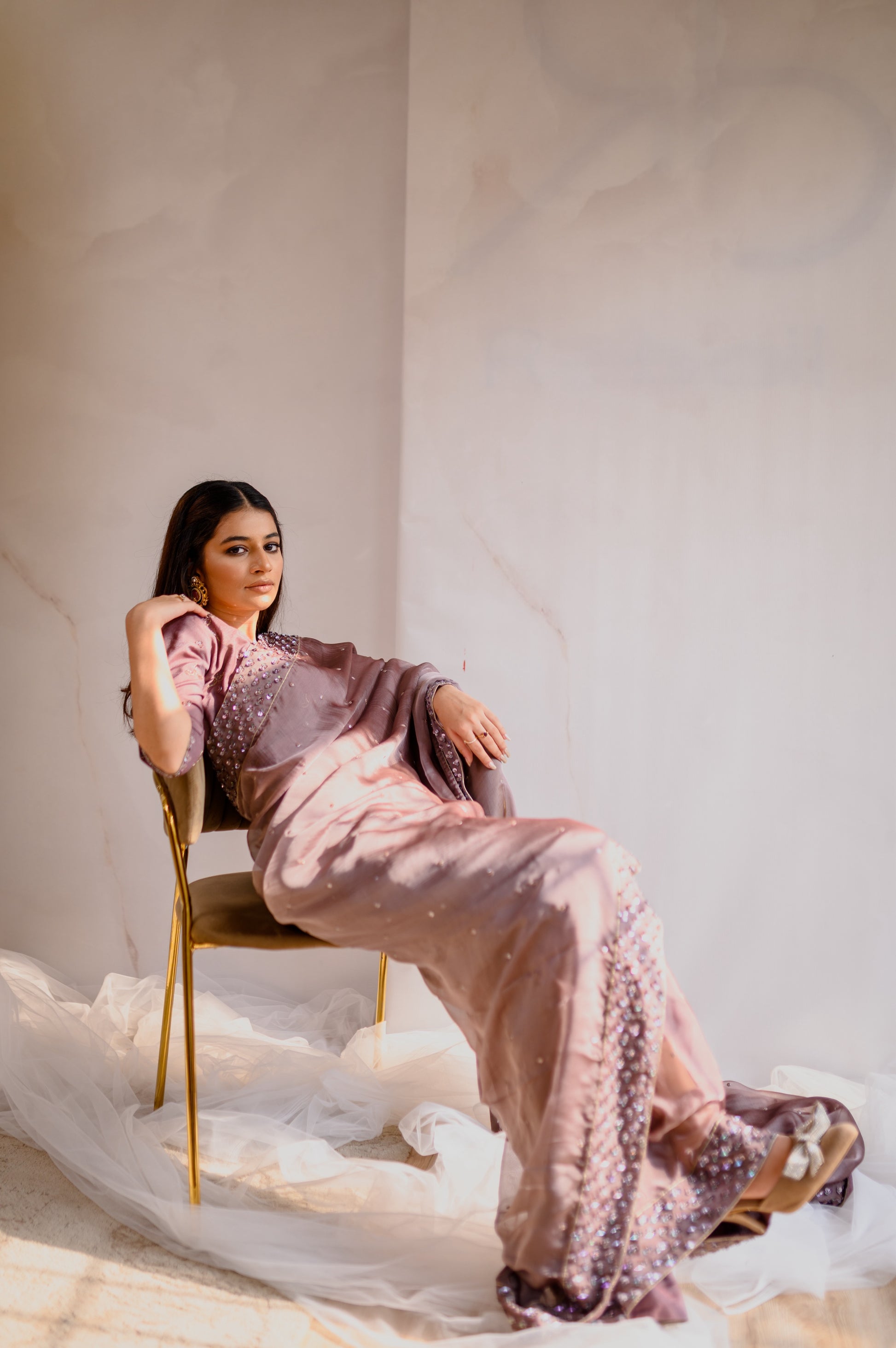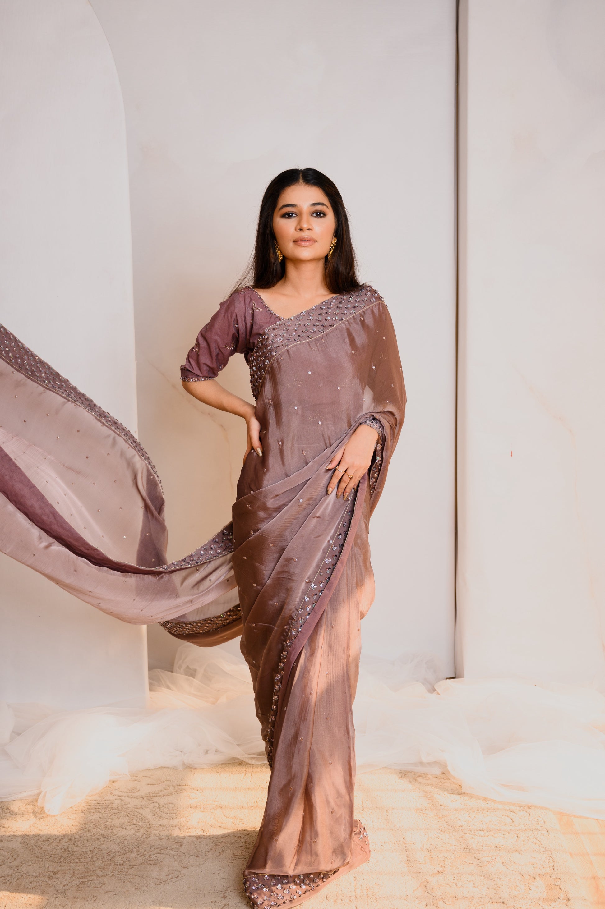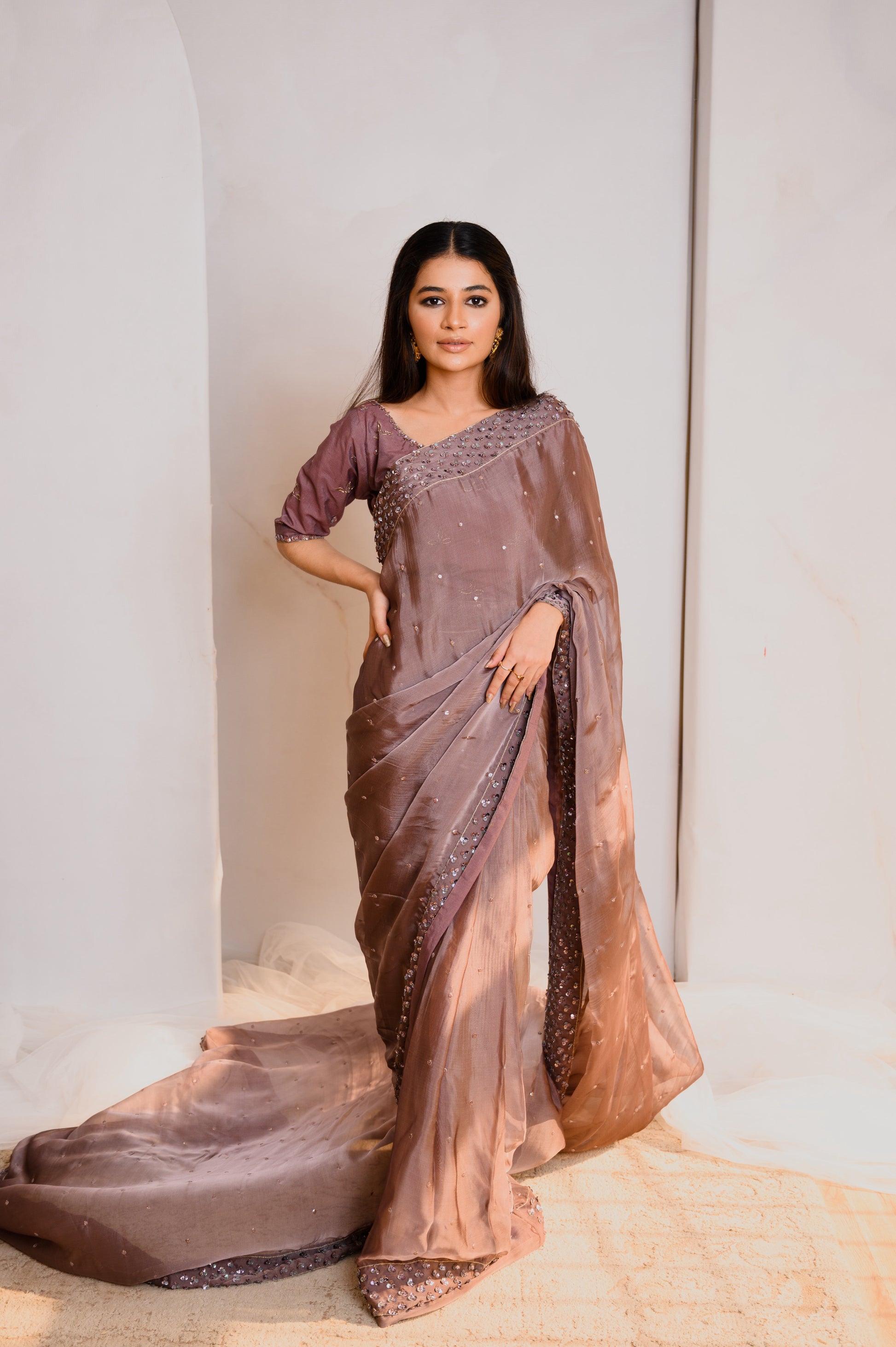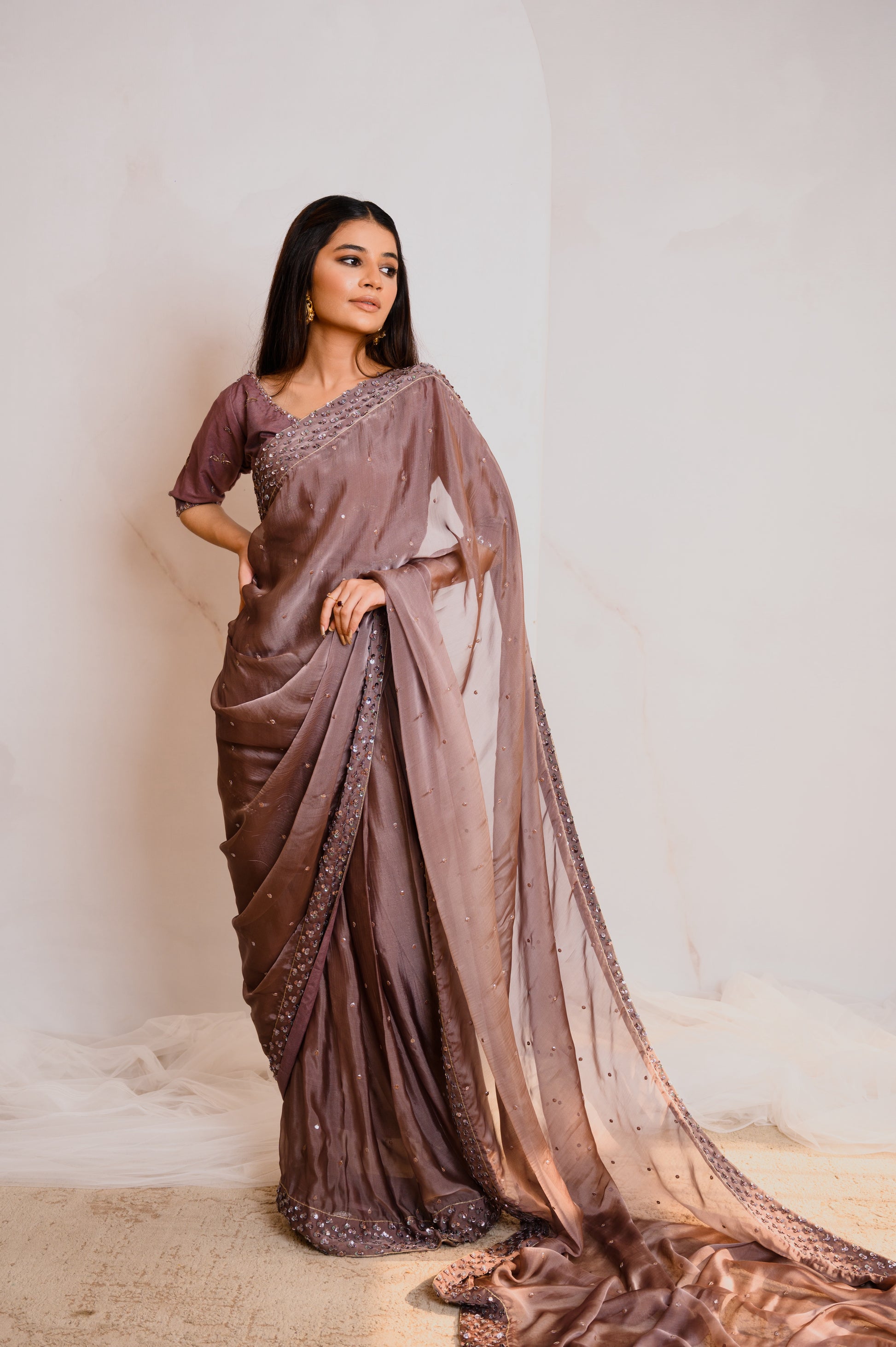Experience the fusion of serenity and allure with this mink color saree. Crafted from pure silk chiffon, the fabric flows like poetry in a gentle symphony of refinement. The saree is adorned with delicately sewn sequins borders, catching the light with every movement and casting a subtle shimmer that echoes sophistication.