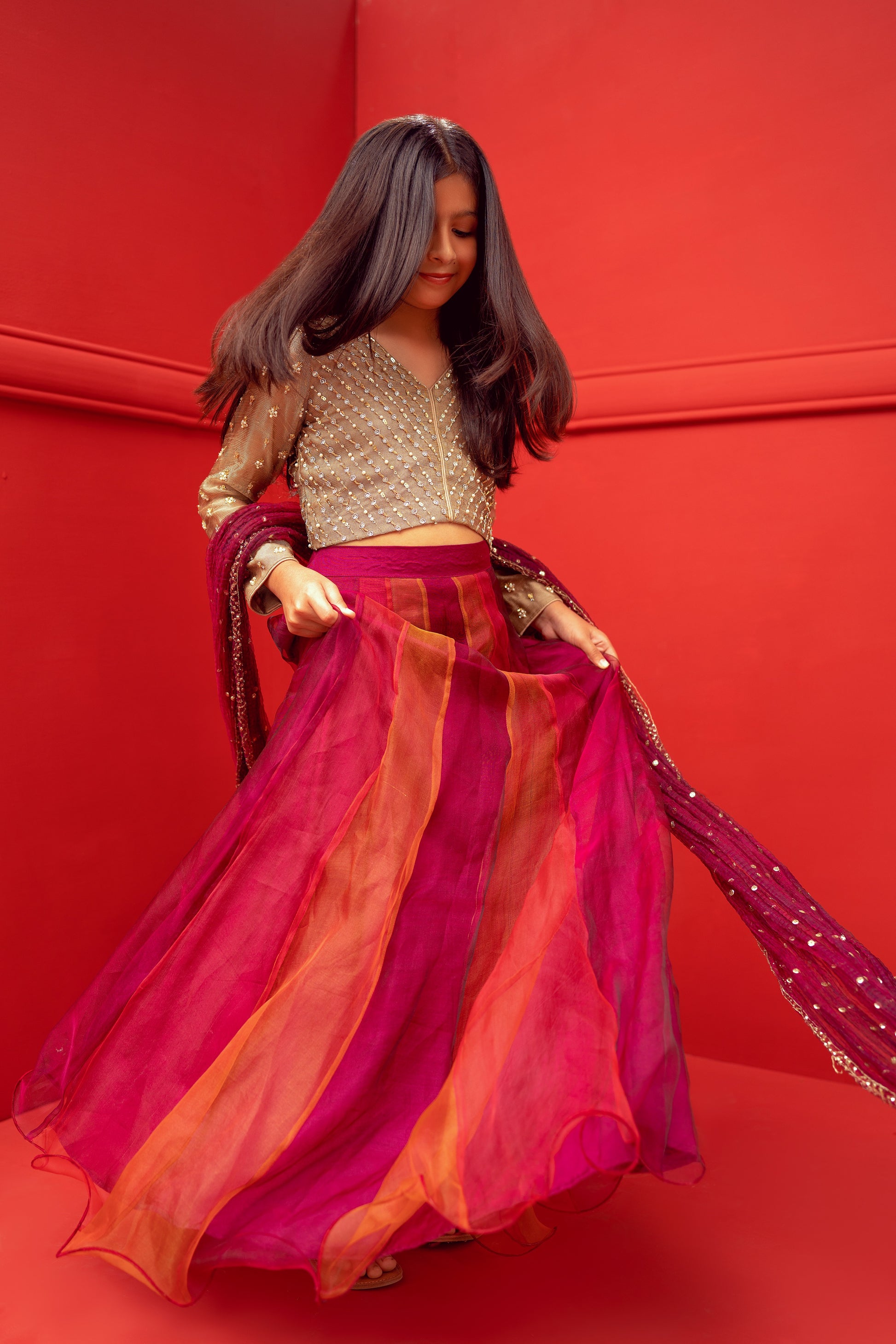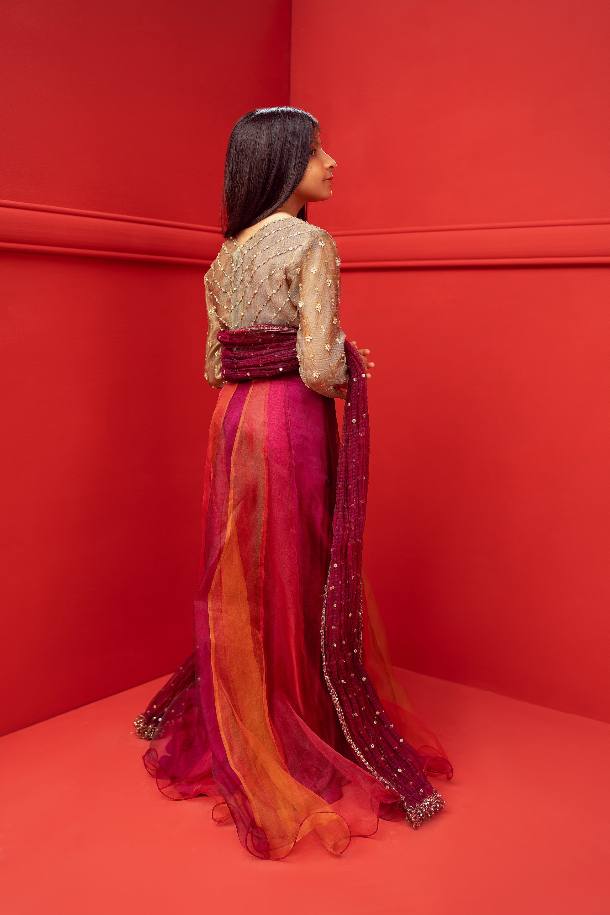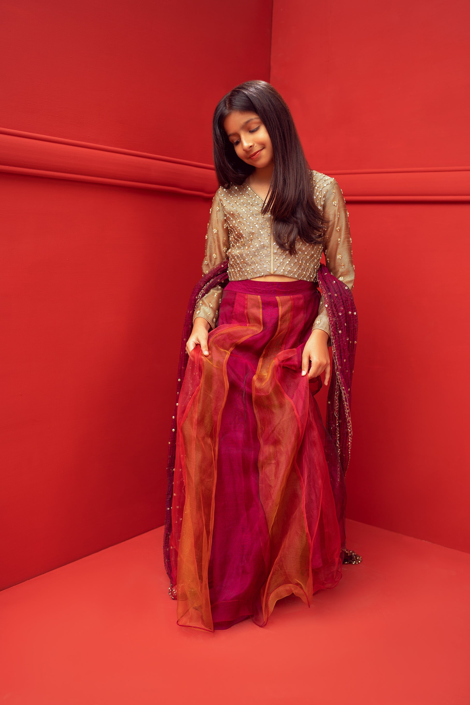 Add a touch of elegance to your little girl's wardrobe with our golden choli featuring intricate hand work embellished with sequins, dabka, and stones. Paired perfectly with a three-tone paneled sharara crafted from organza, this ensemble exudes grace and charm. The choli is adorned with stunning embroidery that extends all over, accentuating its beauty and making it a standout outfit for special occasions.
