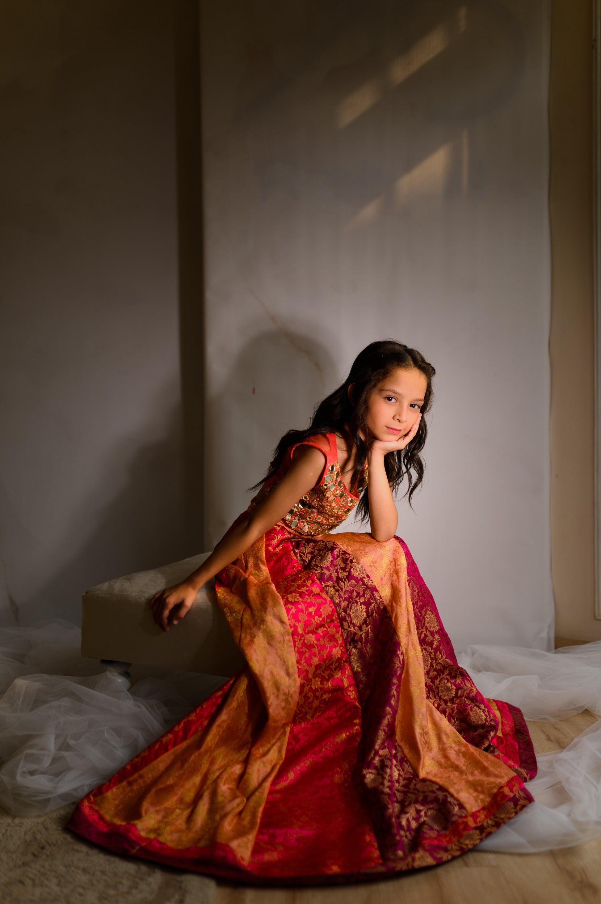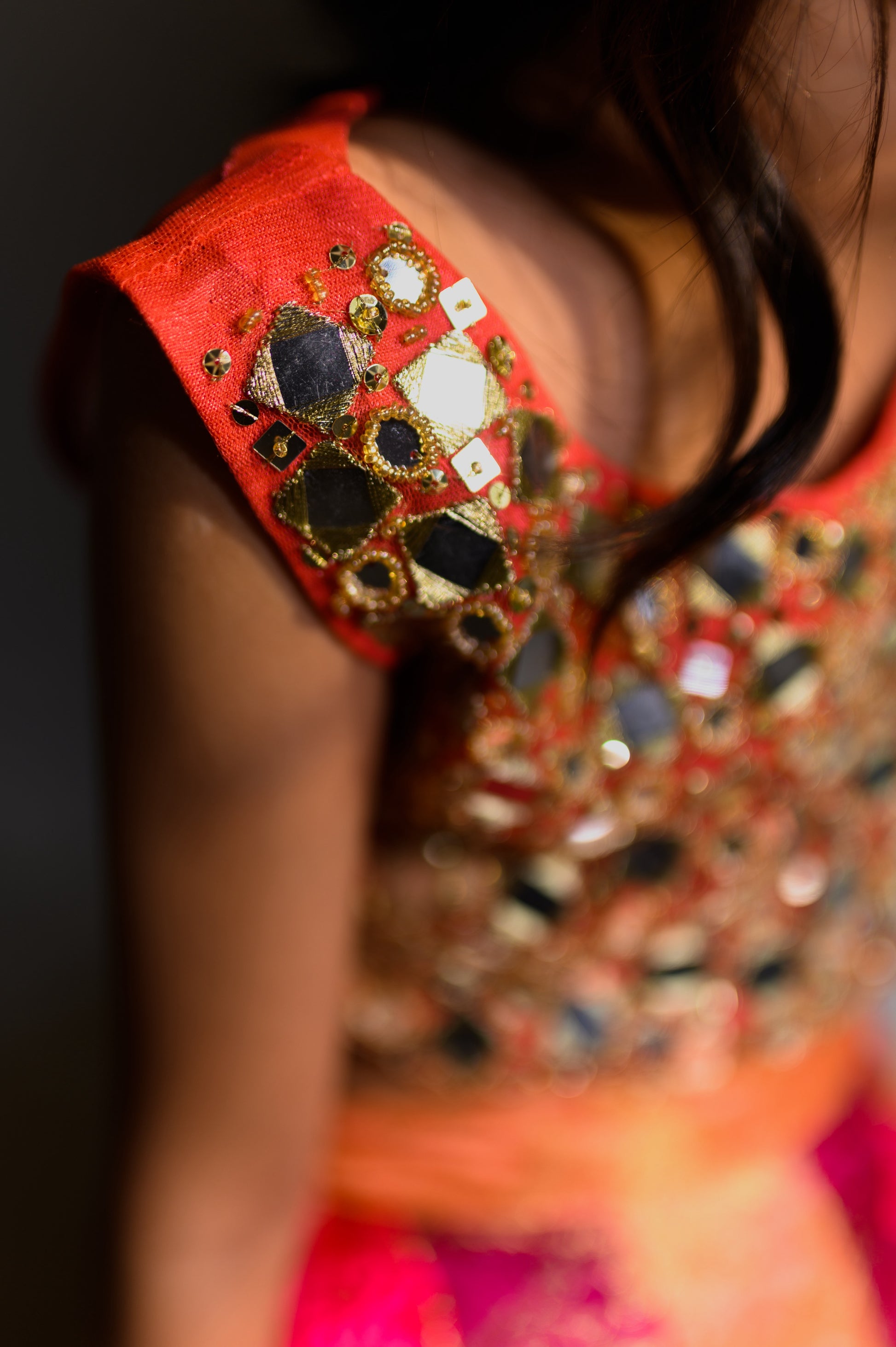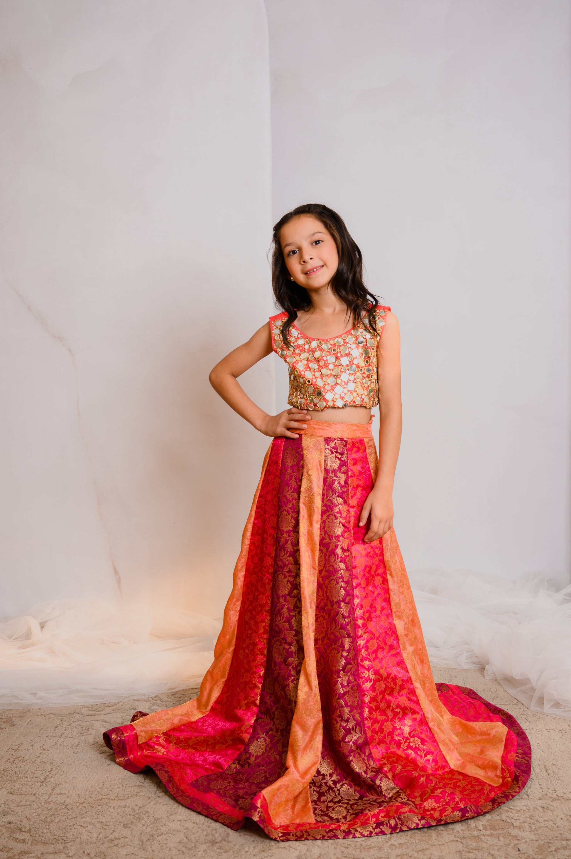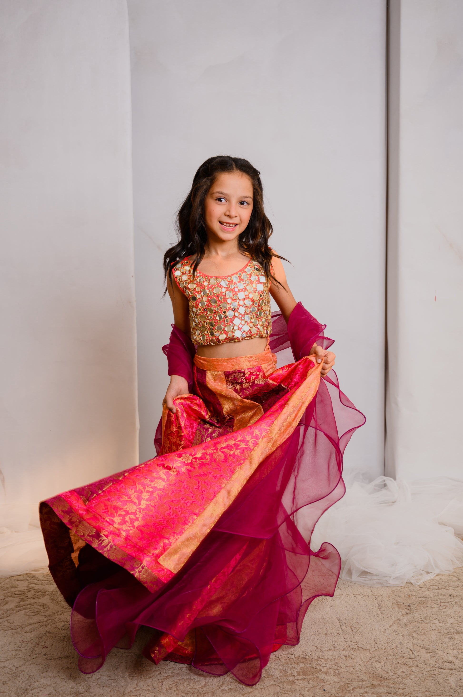 Adorn your little one in a kaleidoscope of joy with this enchanting dress. The mirror work choli captures the essence of playfulness while The three-tone Banaras sharara adds a touch of tradition with its vibrant blend of pink, purple, and orange hues, creating a visual symphony. Each thread weaves a story of cultural richness, while the mirrors twinkle like stars.