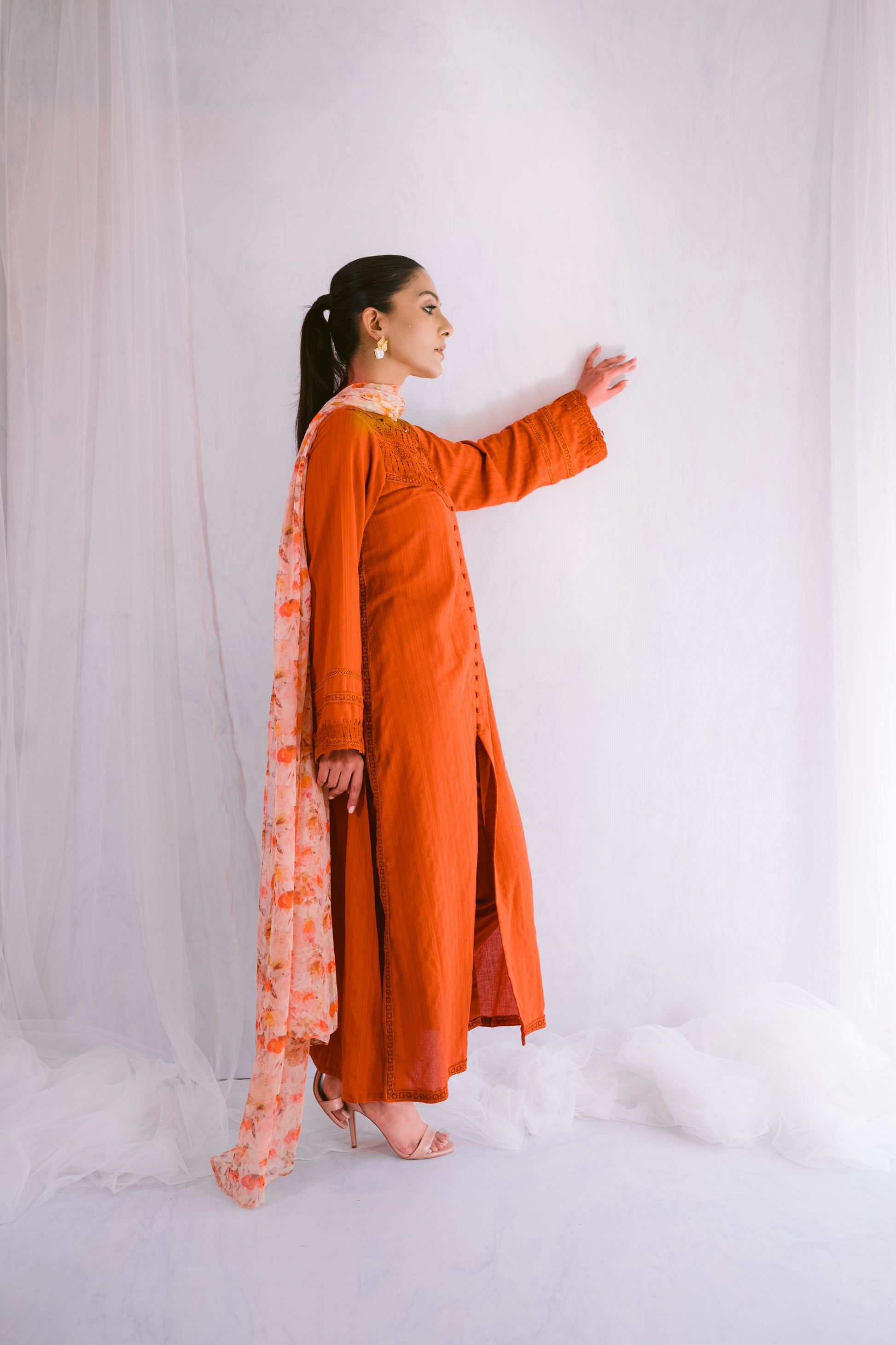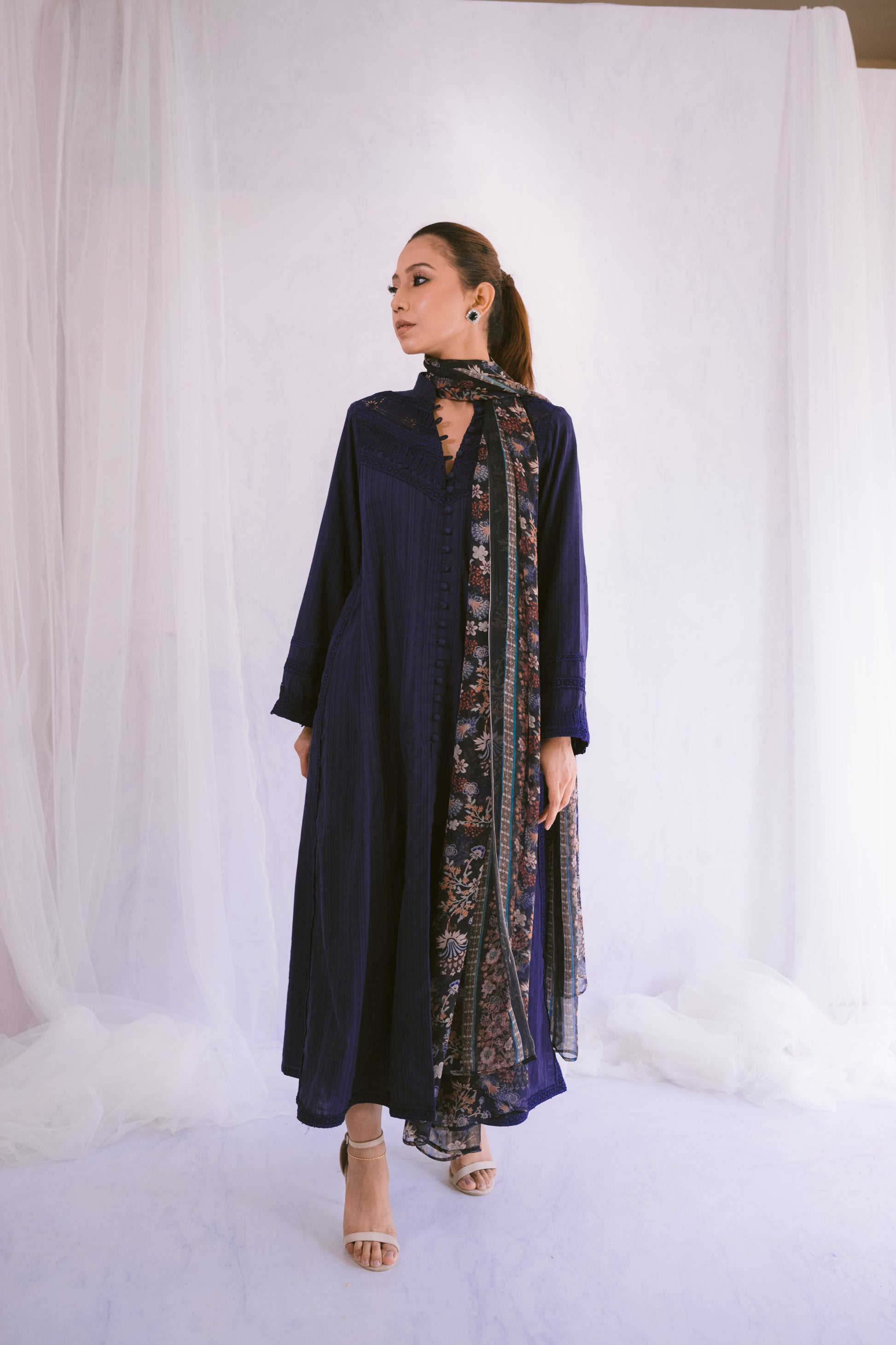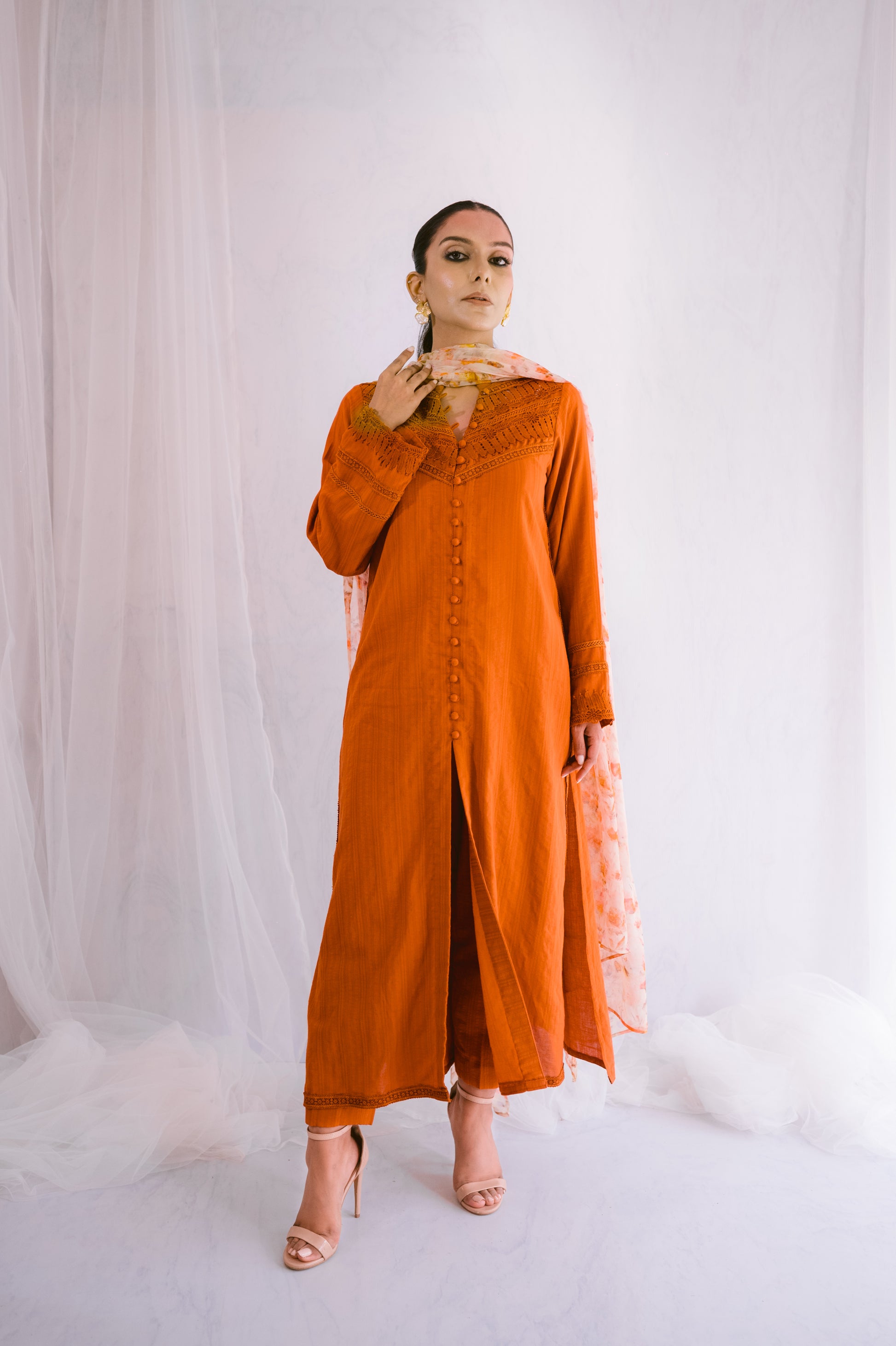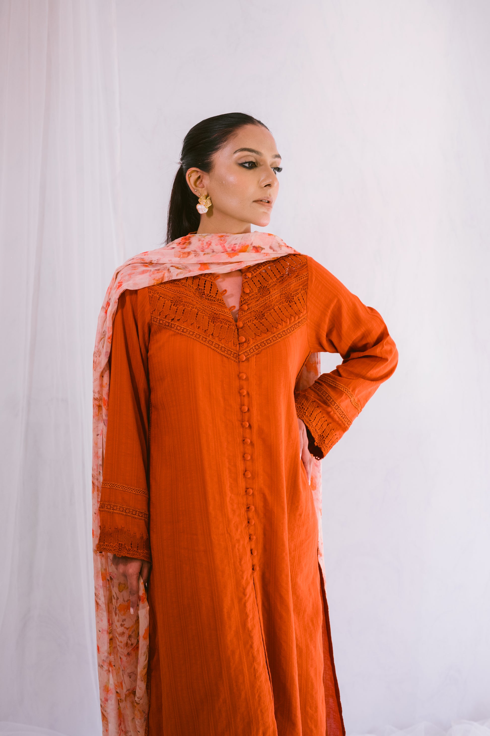 Enhance your style with this self-lawn A-line shirt, featuring delicate lace details for a refined look. Paired with a printed chiffon dupatta, this ensemble effortlessly combines elegance and charm. Perfect for any occasion, it adds a touch of sophistication to your wardrobe