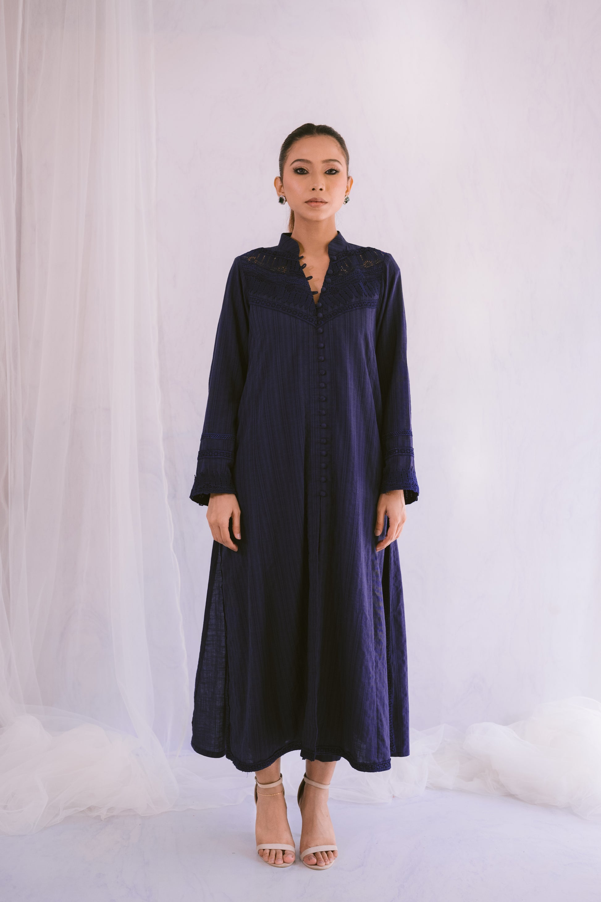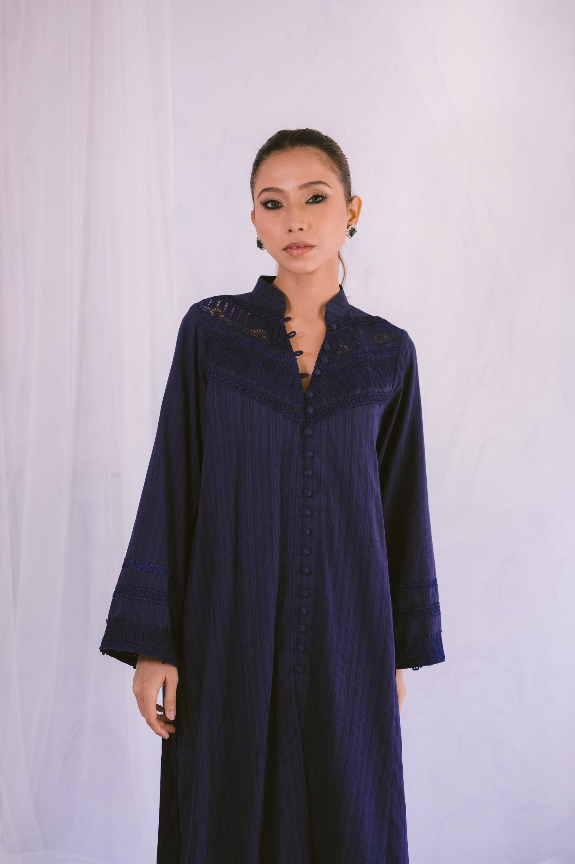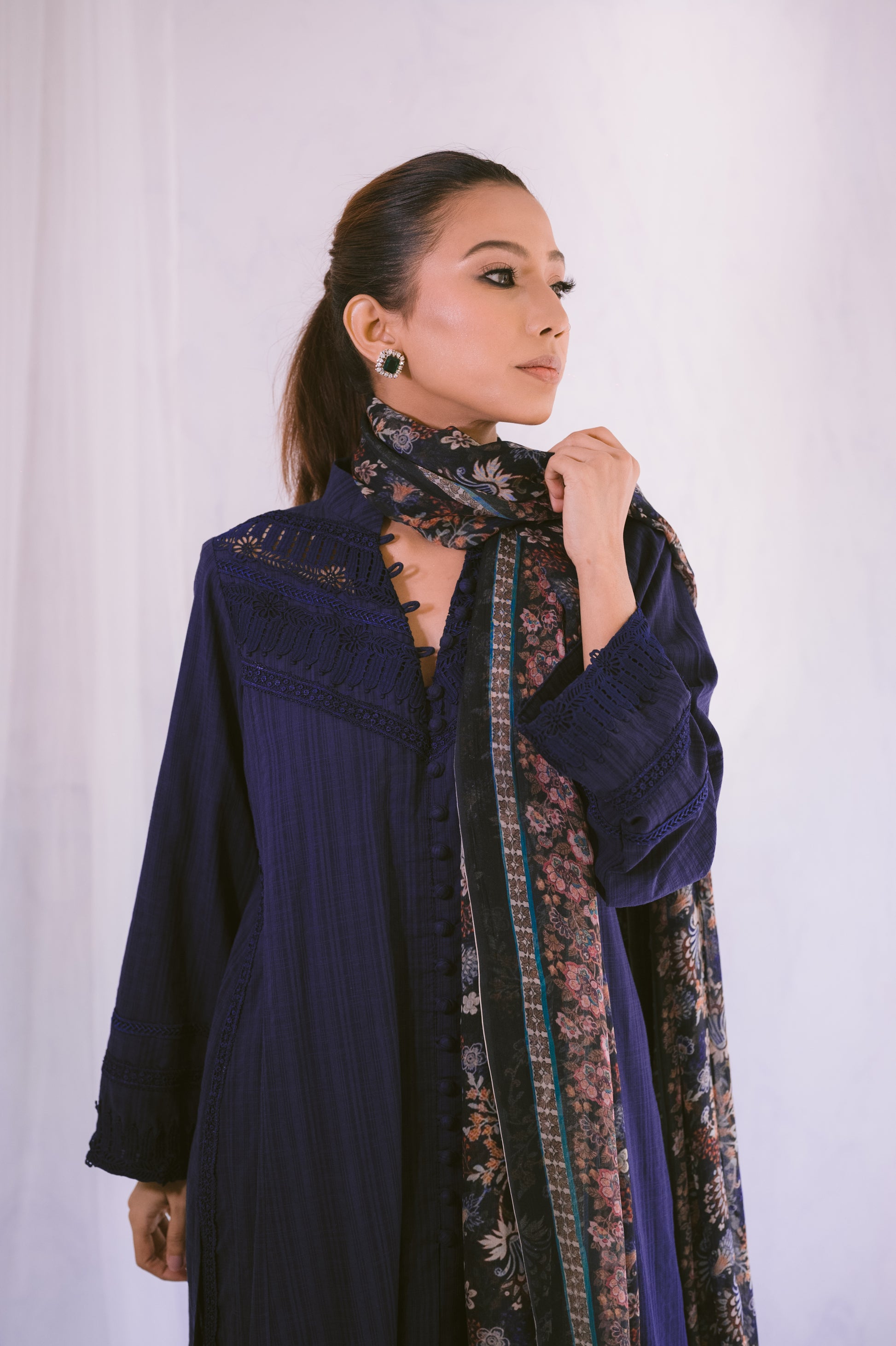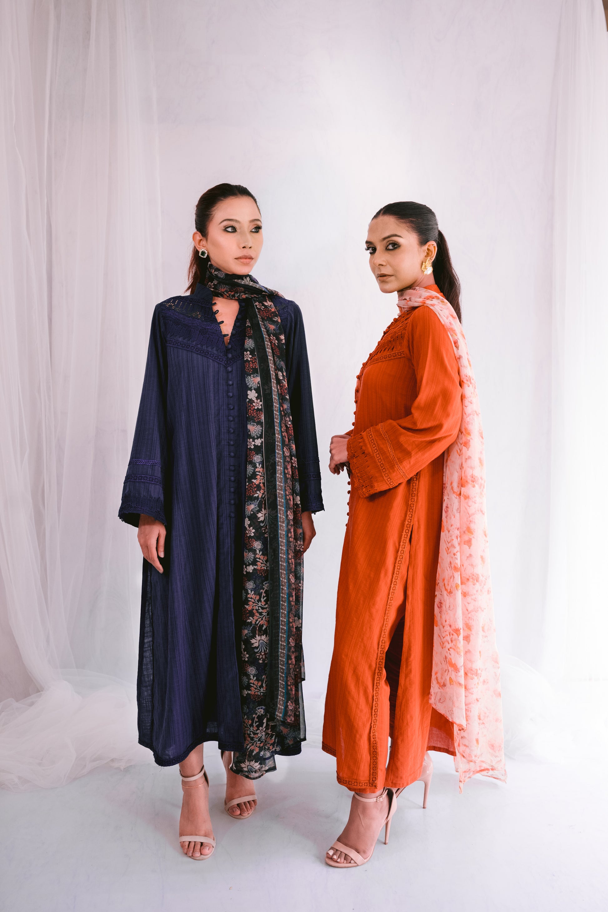 Enhance your style with this self-lawn A-line shirt, featuring delicate lace details for a refined look. Paired with a printed chiffon dupatta, this ensemble effortlessly combines elegance and charm. Perfect for any occasion, it adds a touch of sophistication to your wardrobe