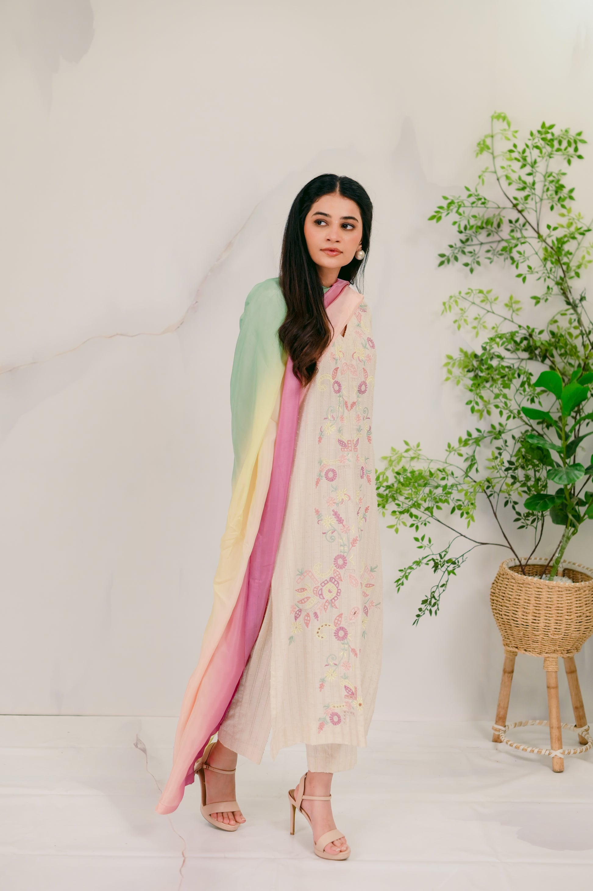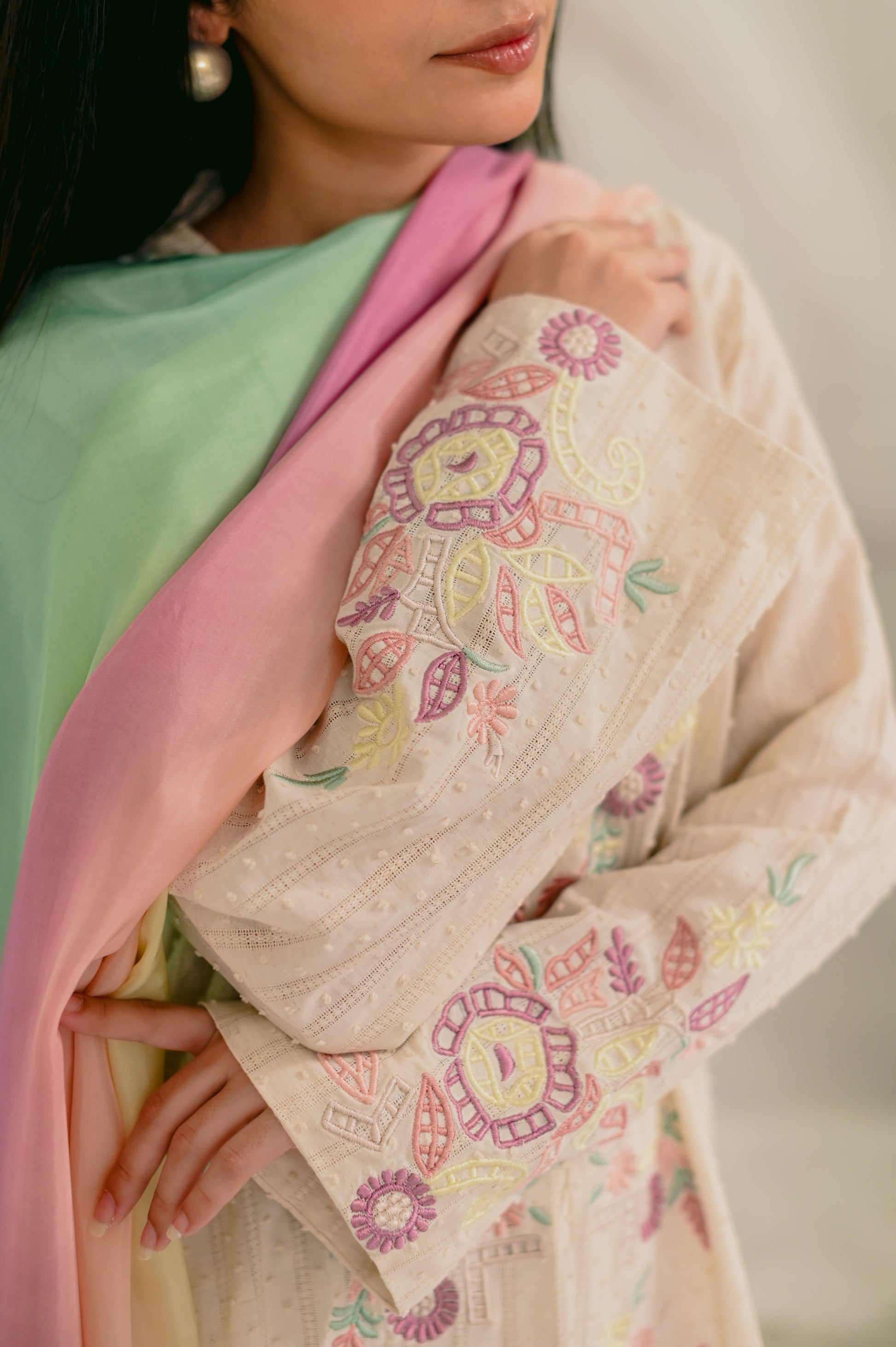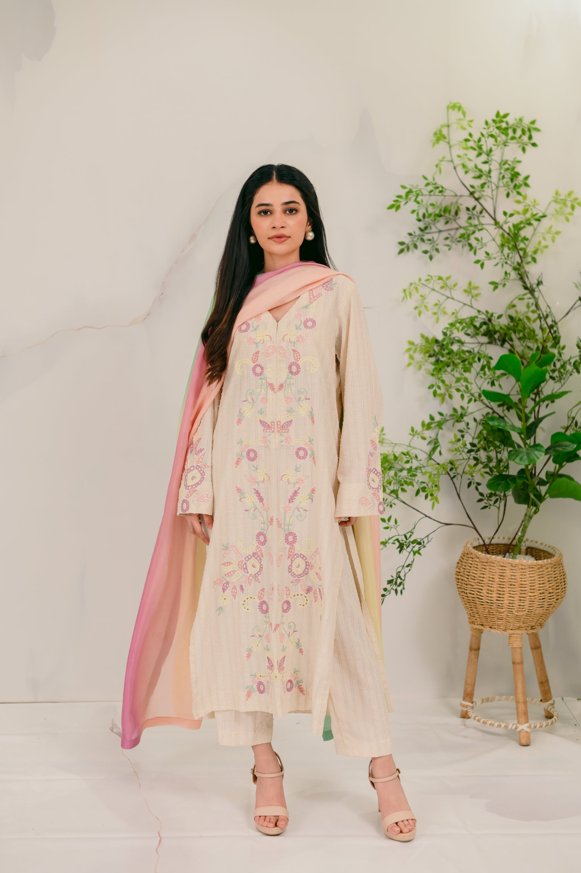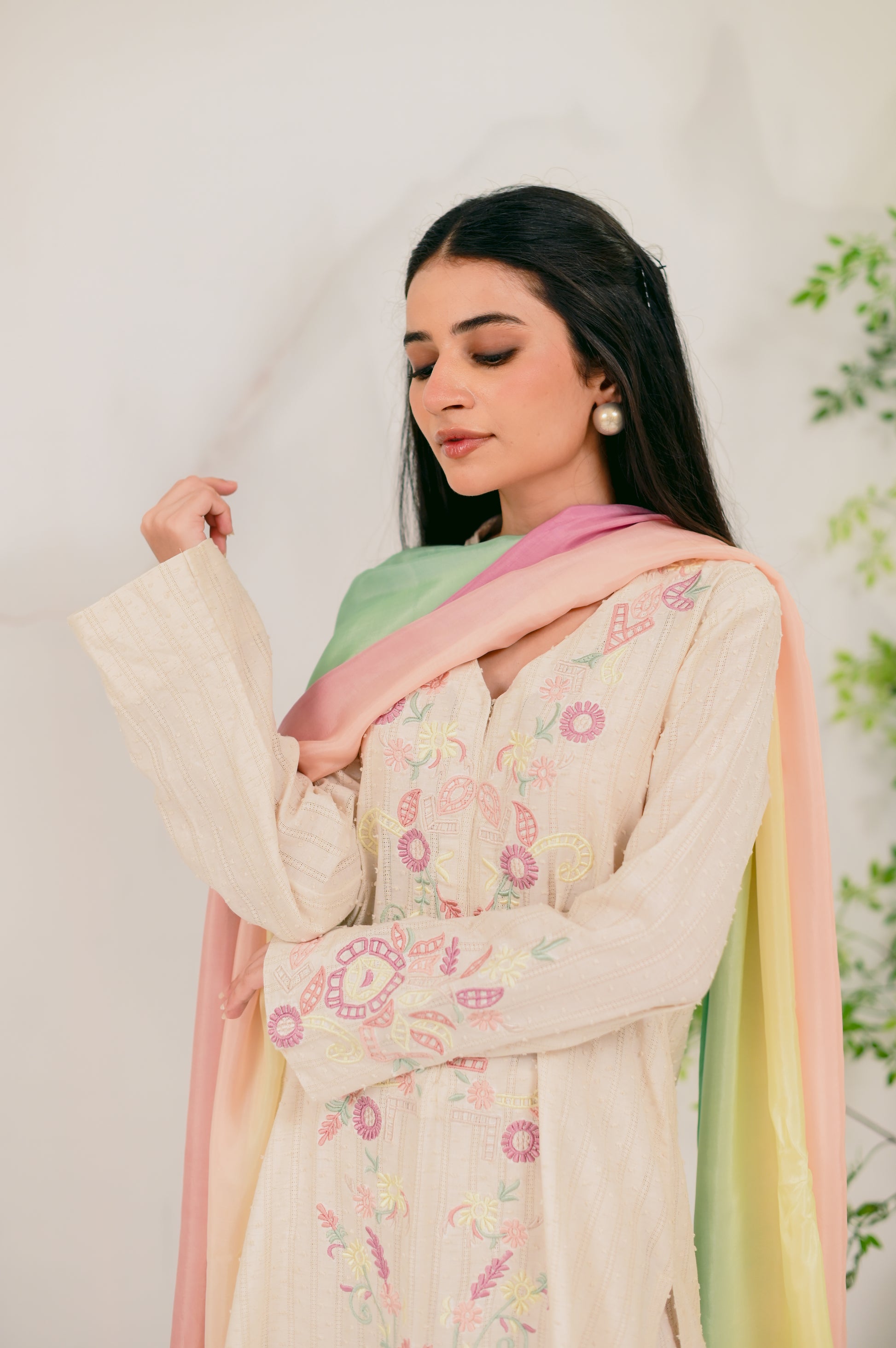 Introducing Tinsel: an exquisite off-white textured cotton ensemble adorned with vibrant multi-colored machine embroidery, perfect for capturing the spirit of Eid mornings. This stunning attire features a beautifully shaded silk dupatta that adds a touch of elegance to your festive look. Elevate your celebrations with Tinsel, where comfort meets style. Ideal for Eid gatherings and special occasions, this outfit promises to make you stand out. Shop now and embrace the essence of festive fashion with Tinsel!