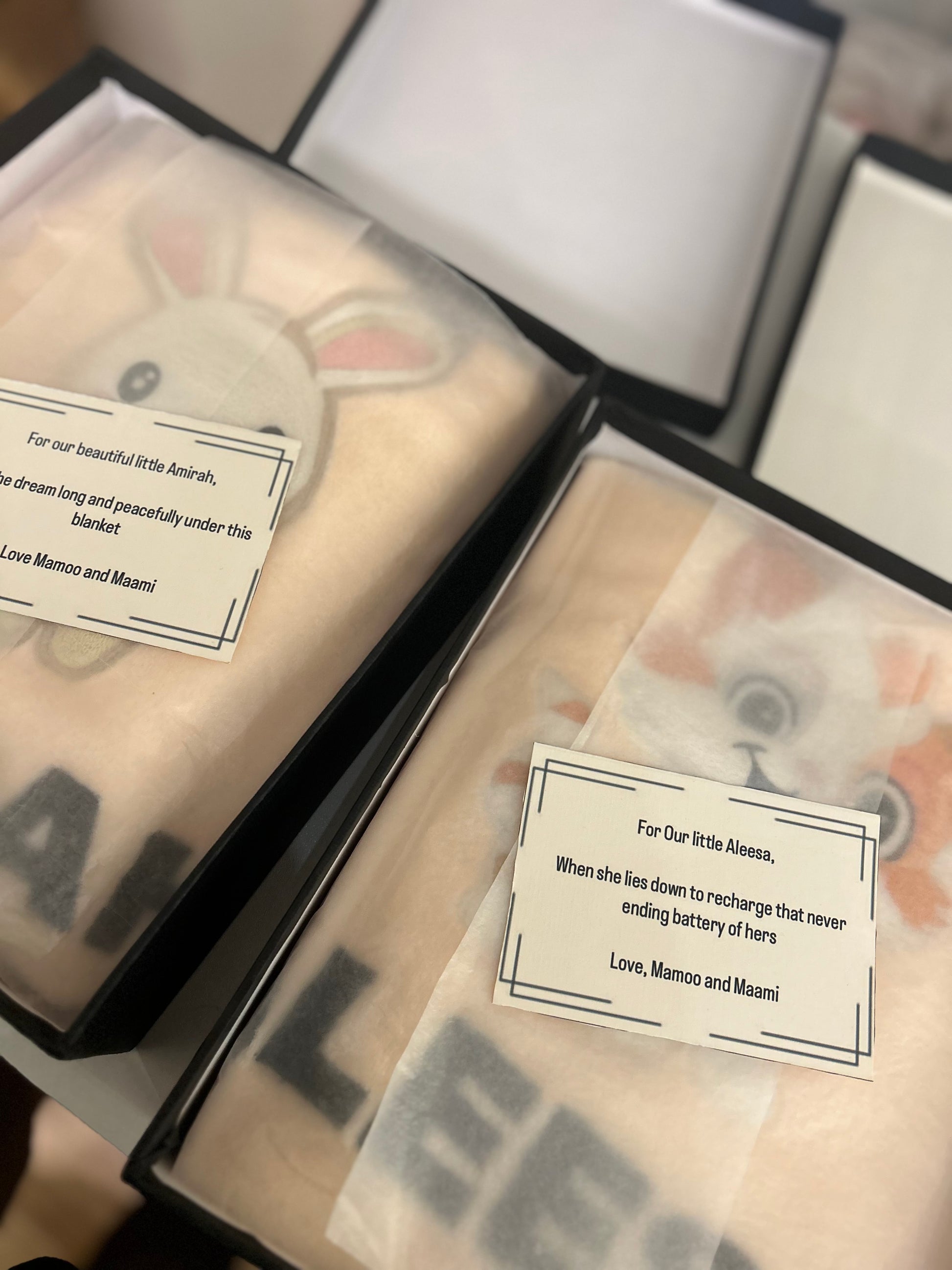 Please WhatsApp us at +92322-2737090 with your order number and the name you would like to have on your blanket.