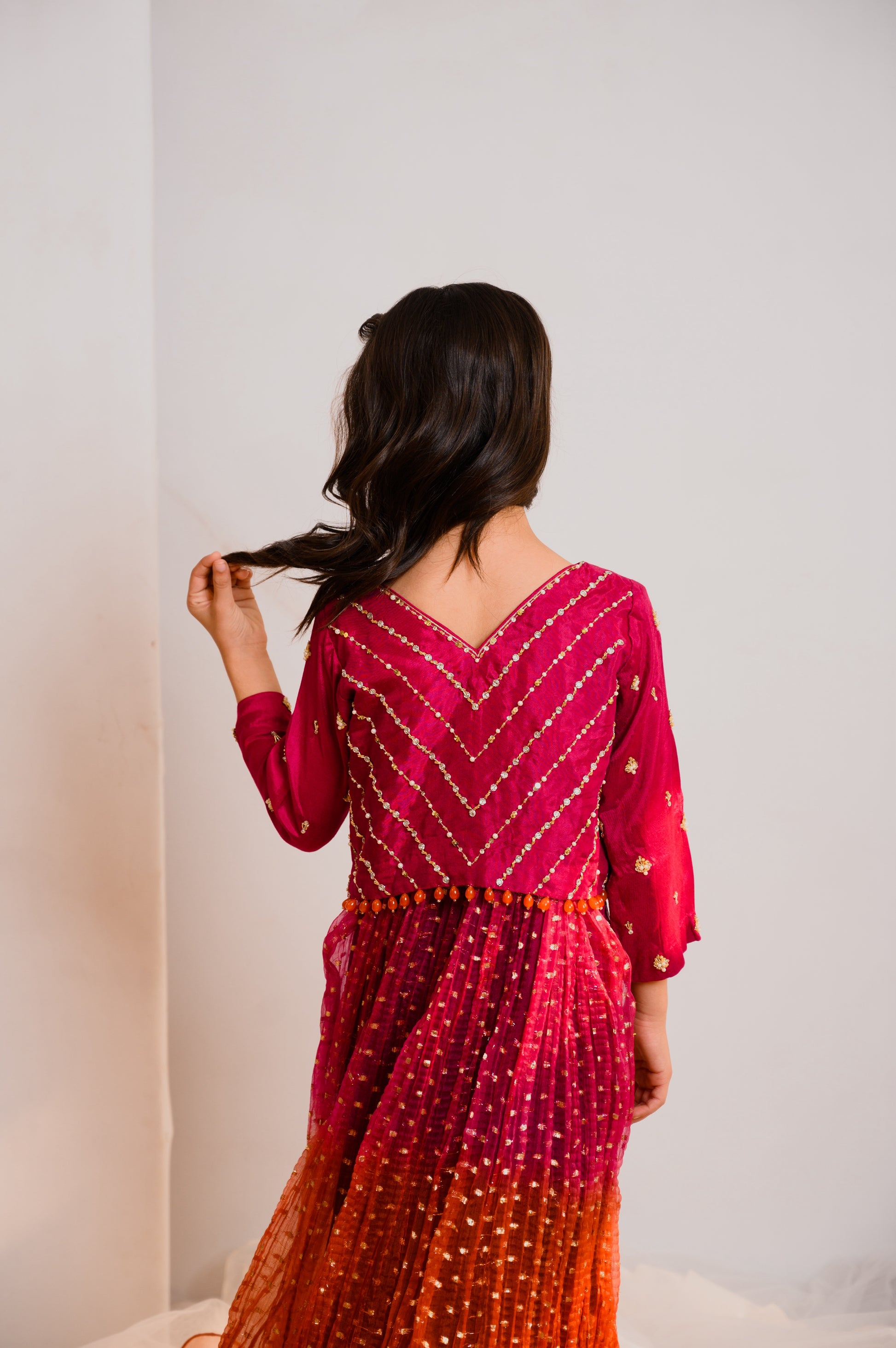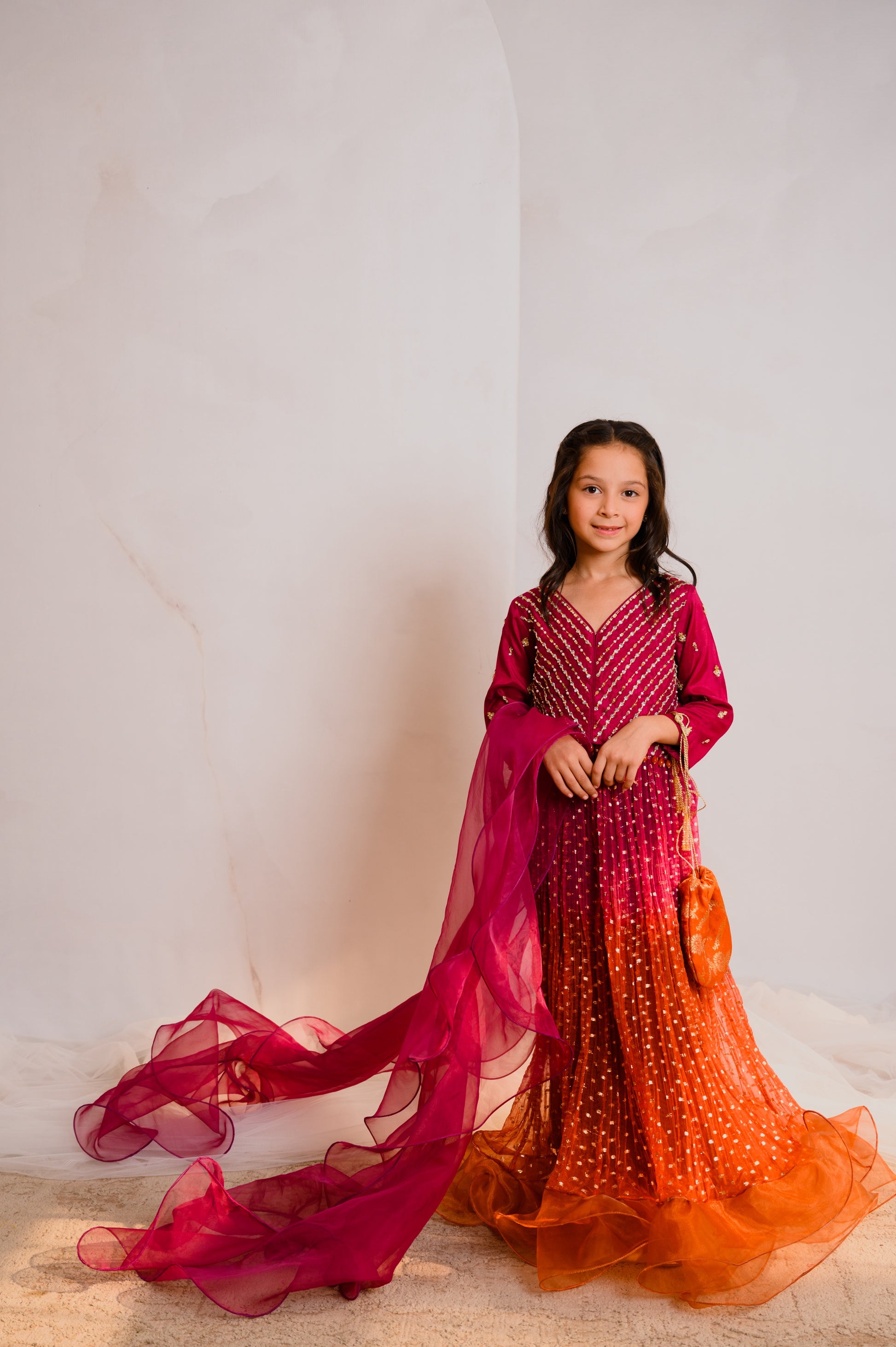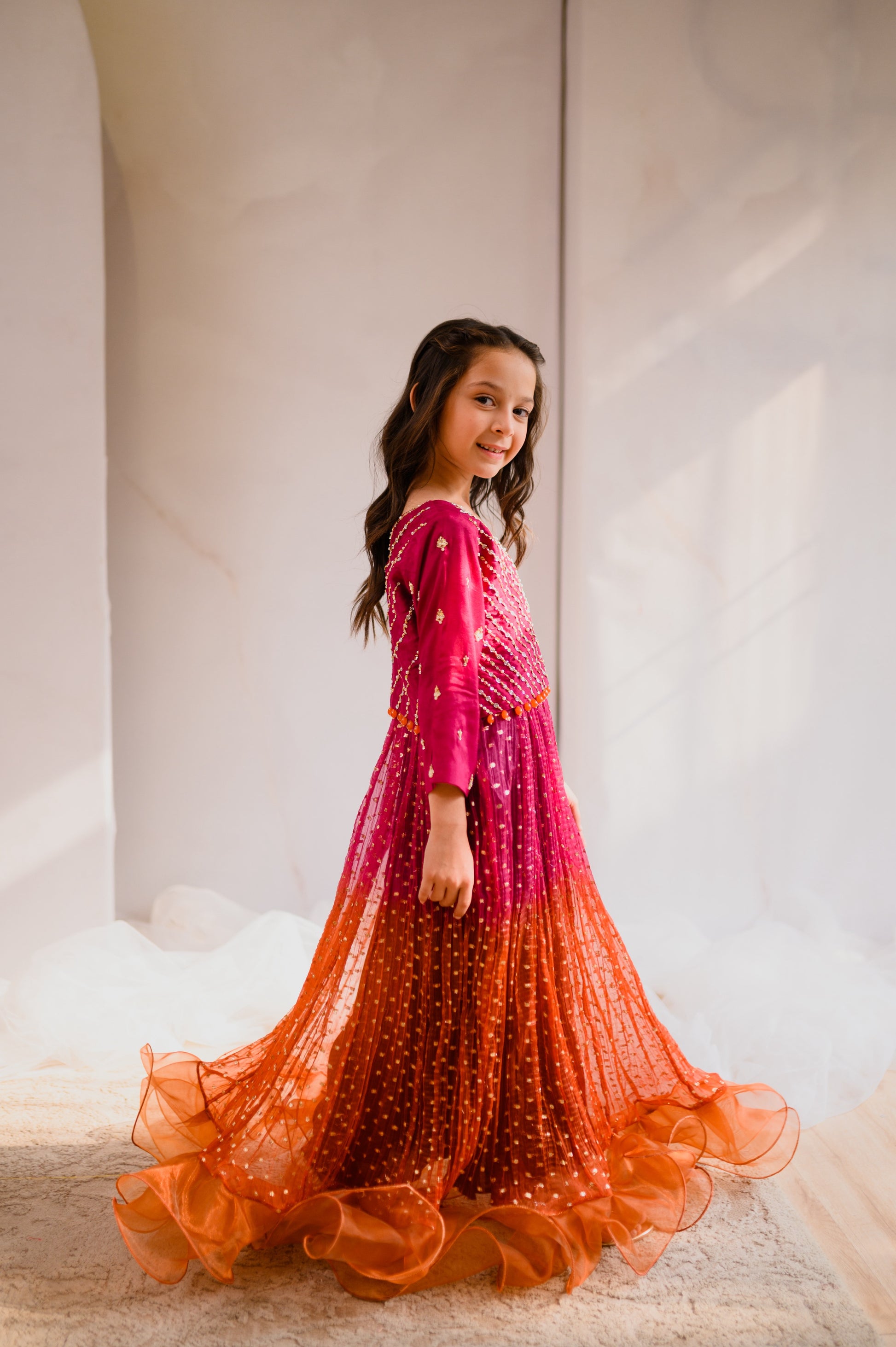 Introduce a burst of joy into your little one's wardrobe with this adorable hot pink and orange ensemble. While the Zara organza shaded crushed inner creates a subtle play of light and shadow adding depth to the ensemble. The color palette, coupled with the ethereal fabric and artisanal charm, turns this dress into a whimsical wonder while the handworked choli becomes a canvas of artistry, with intricate details.