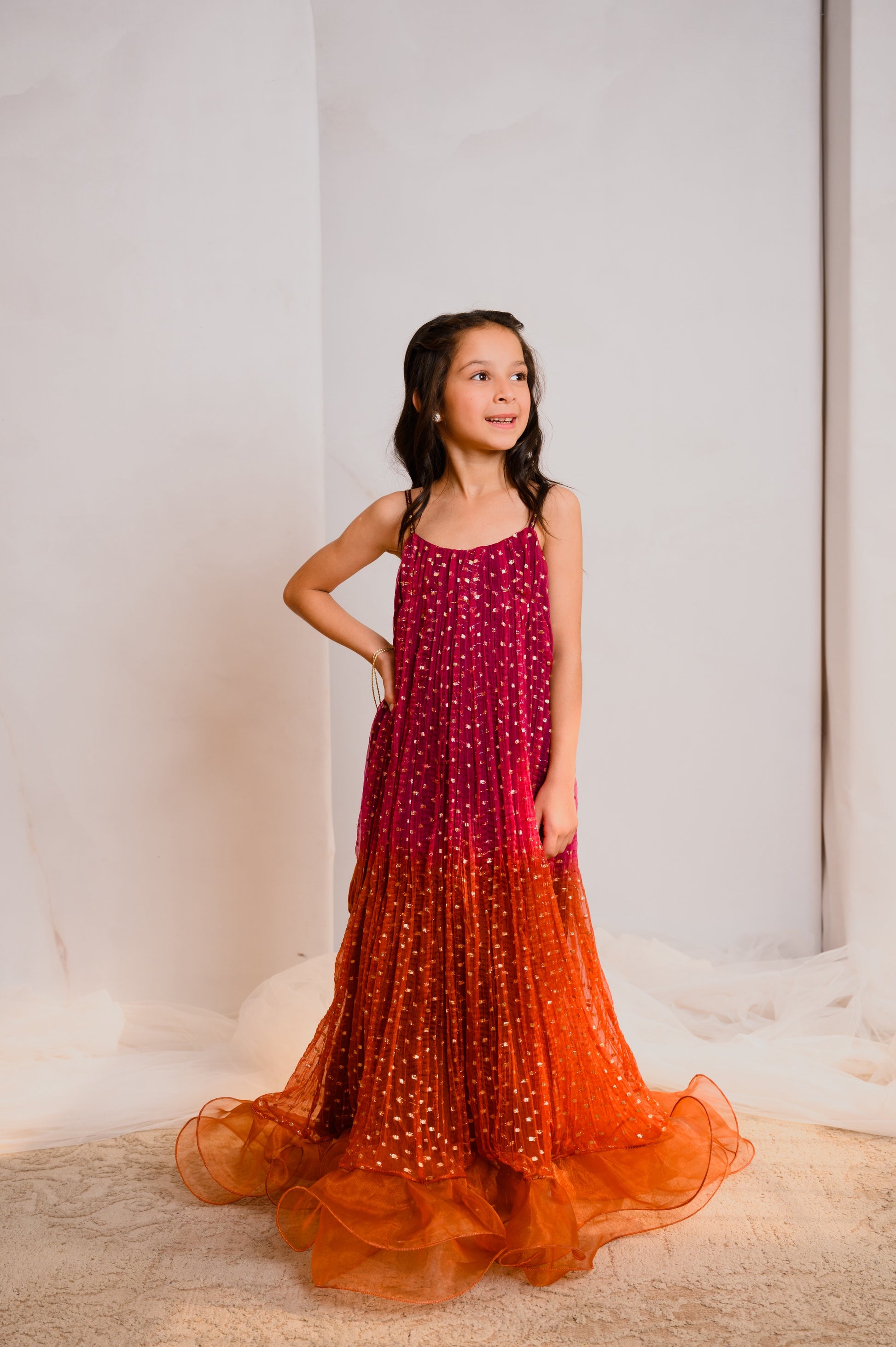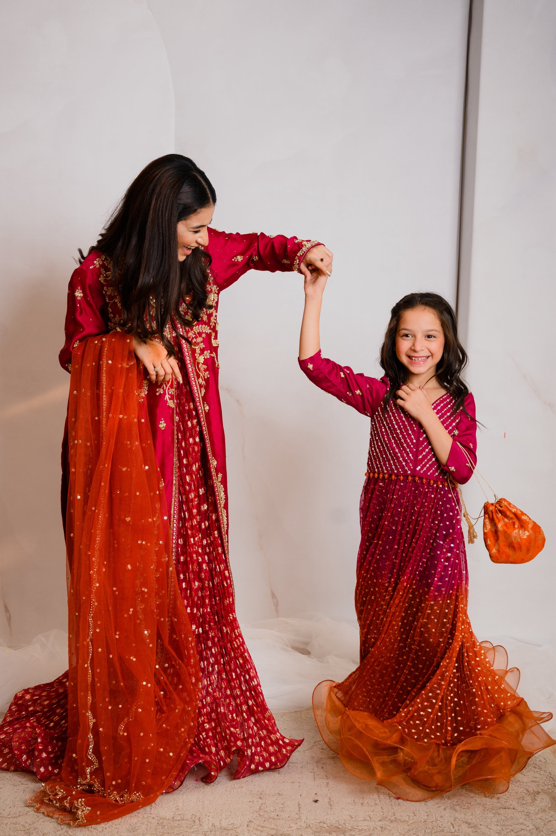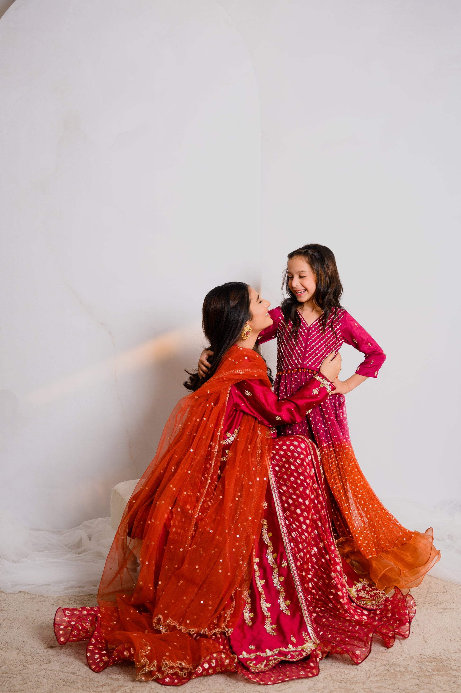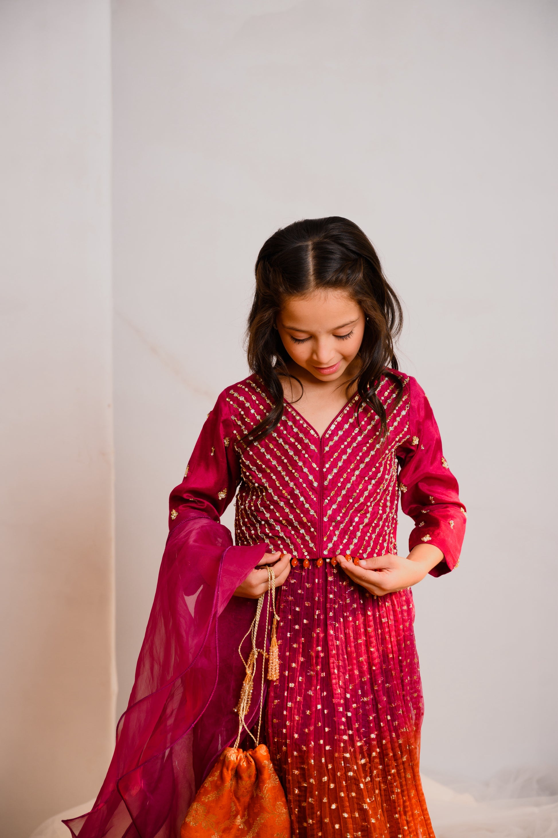Introduce a burst of joy into your little one's wardrobe with this adorable hot pink and orange ensemble. While the Zara organza shaded crushed inner creates a subtle play of light and shadow adding depth to the ensemble. The color palette, coupled with the ethereal fabric and artisanal charm, turns this dress into a whimsical wonder while the handworked choli becomes a canvas of artistry, with intricate details.