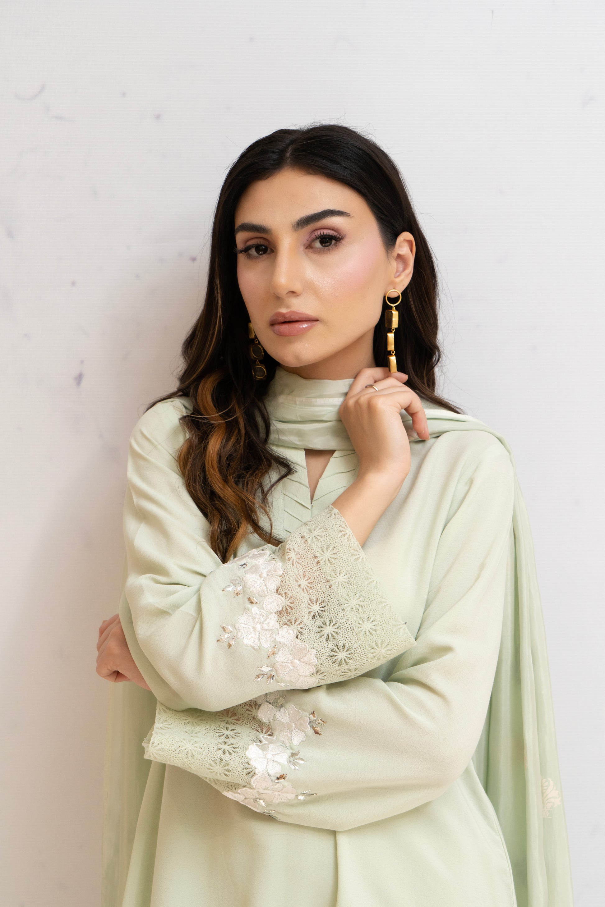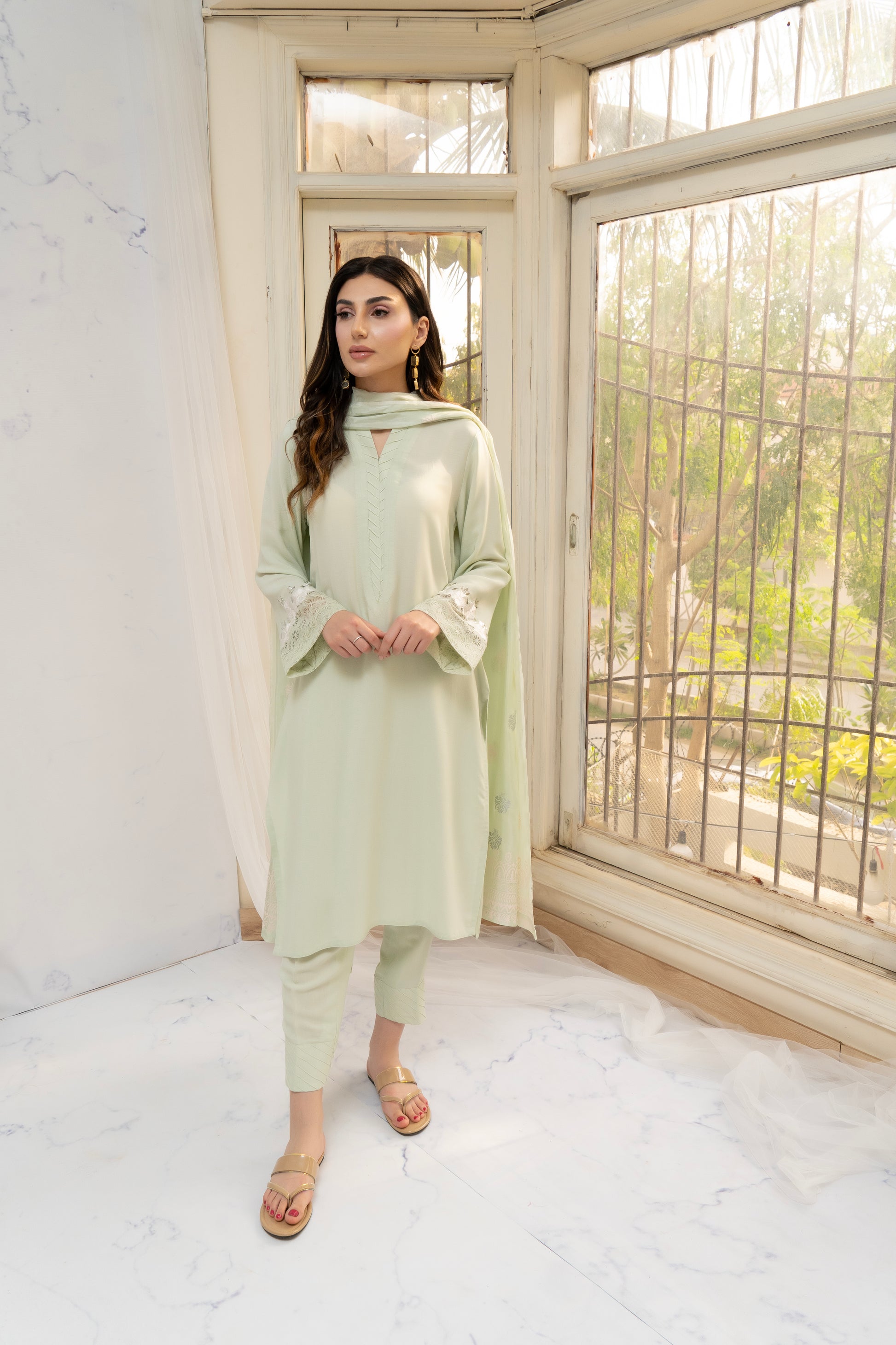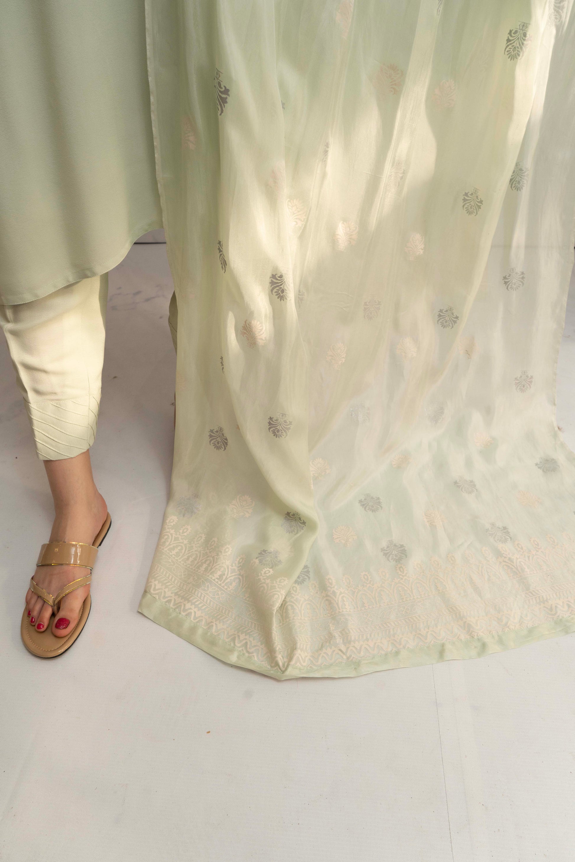 Elevate your everyday style with this simple yet sophisticated 3-piece ensemble in serene mint green. The kurta, with its clean and minimalist aesthetic, exudes understated charm and effortless grace.