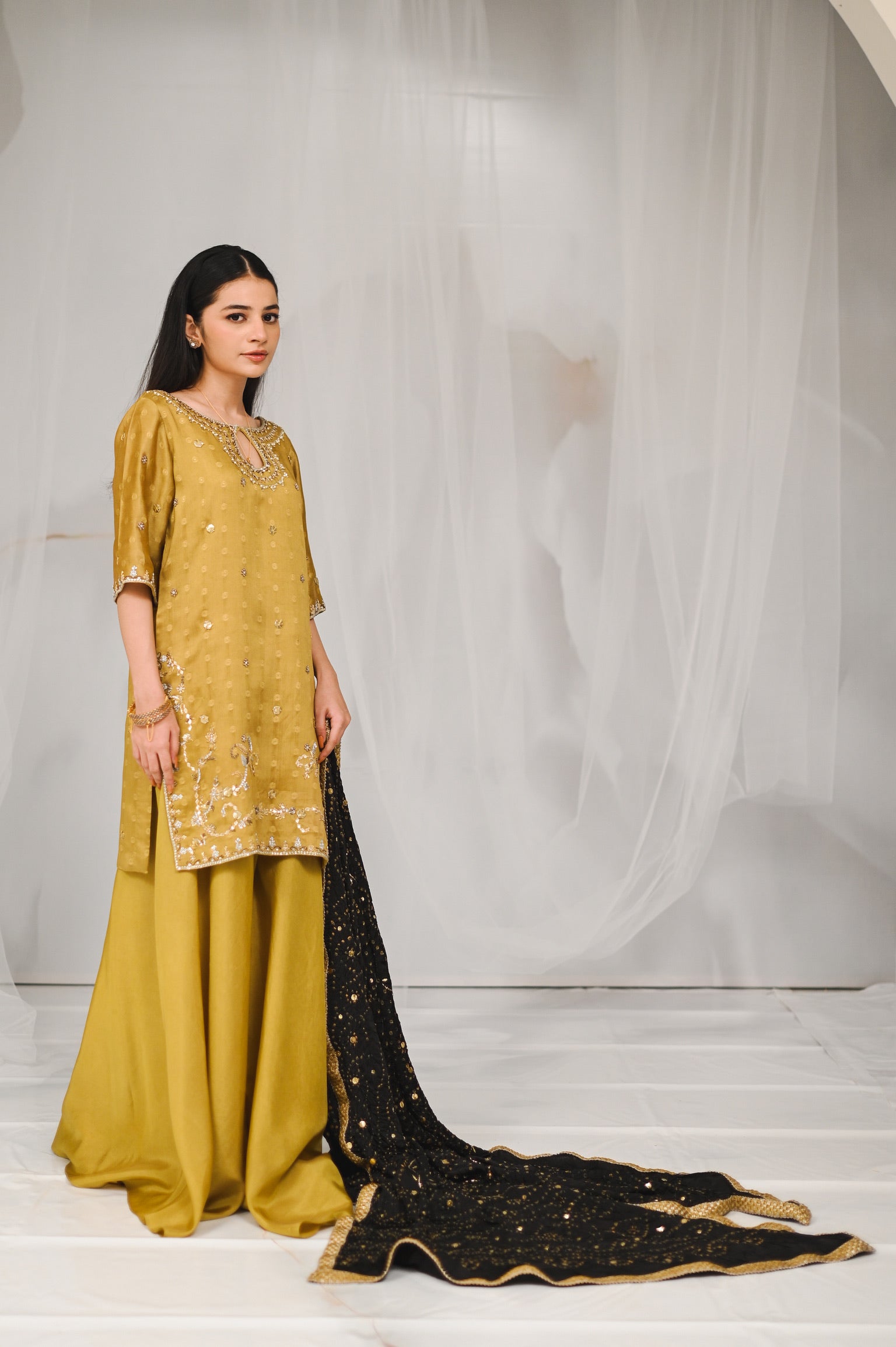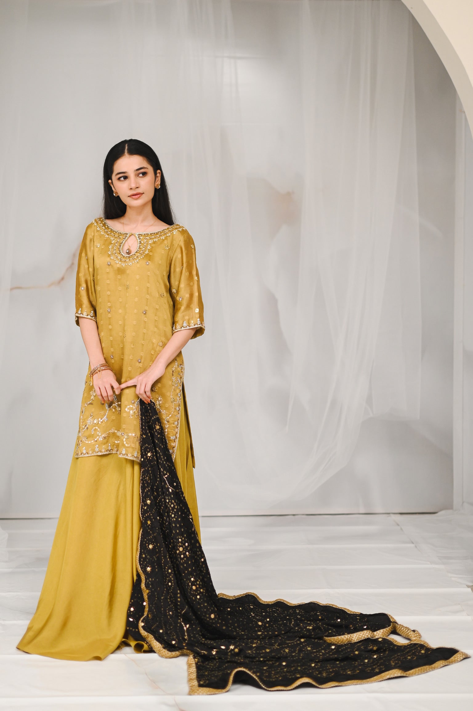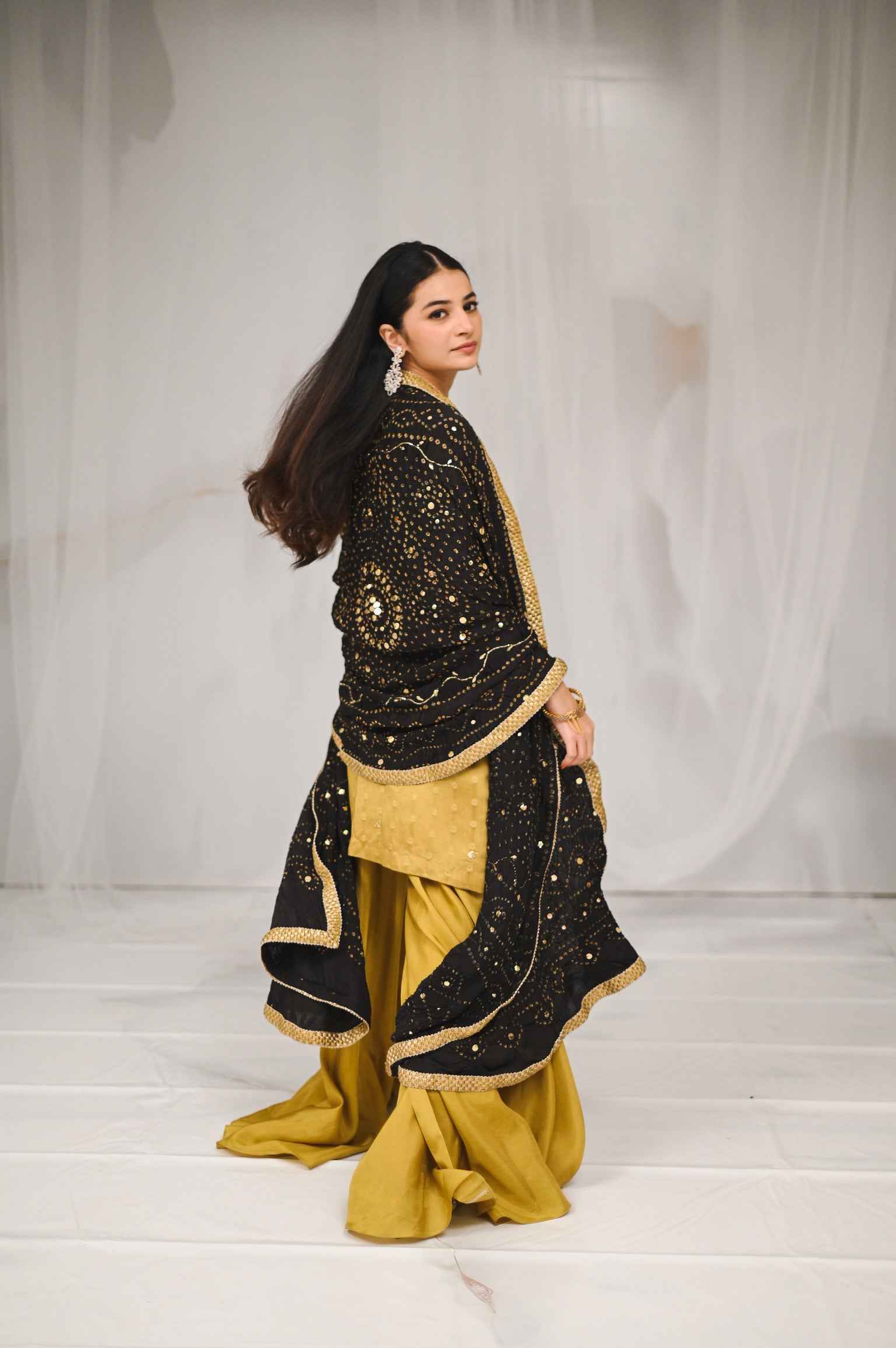 Elevate your formal wardrobe with our exquisite Eastern Pakistani ensemble, featuring a stunning yellow mustard shirt paired with matching Dhaka pants. Adorned with intricate handwork, including sequins, kora, dabka, and Gota, this outfit radiates elegance and tradition. Complete your look with a luxurious black Chunri Dupatta embellished with Kamdani for a touch of sophistication. Perfect for weddings and special occasions, this handcrafted attire not only showcases your unique style but also supports traditional artisans. Shop now to embrace the essence of Eastern elegance!