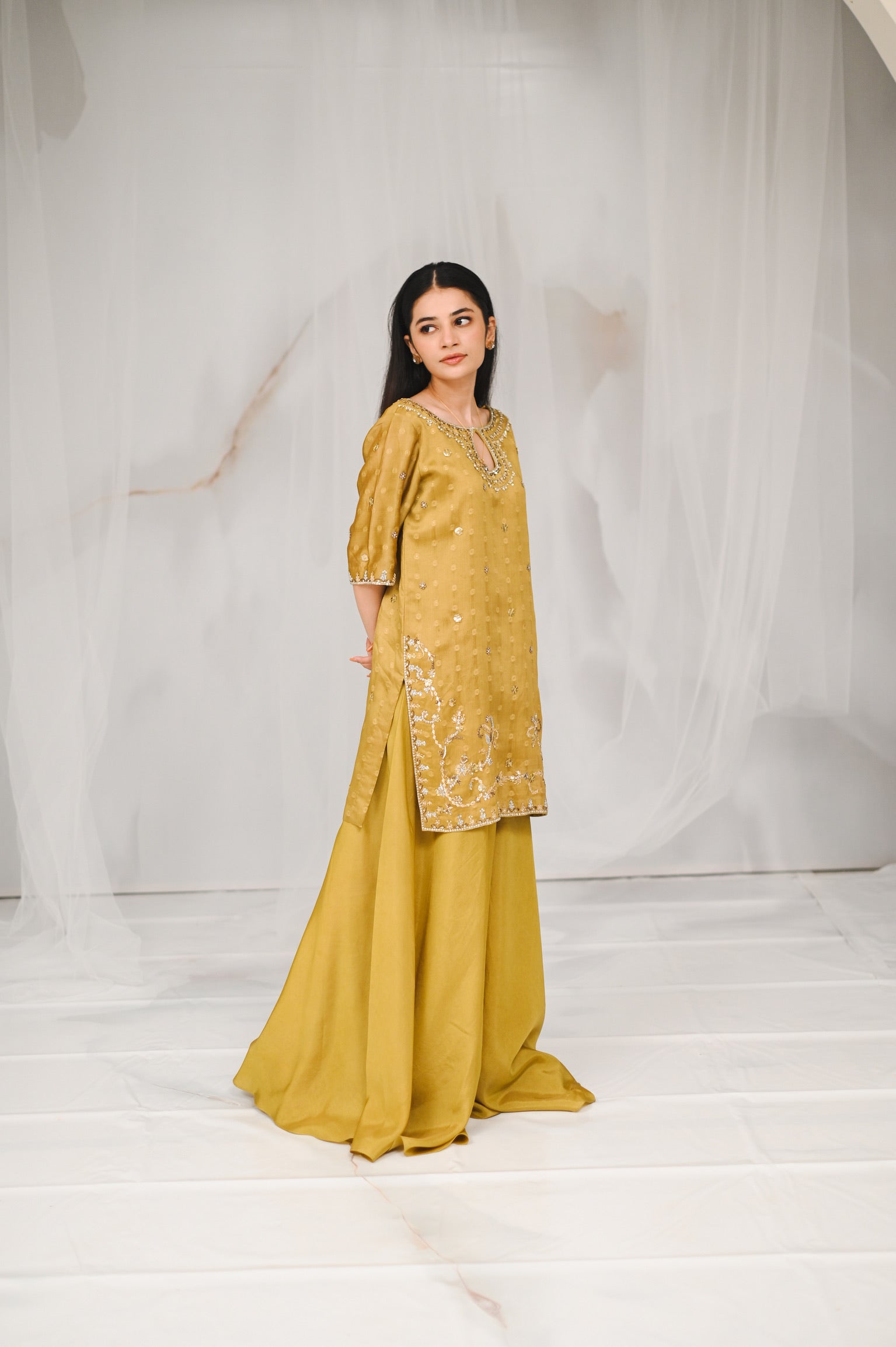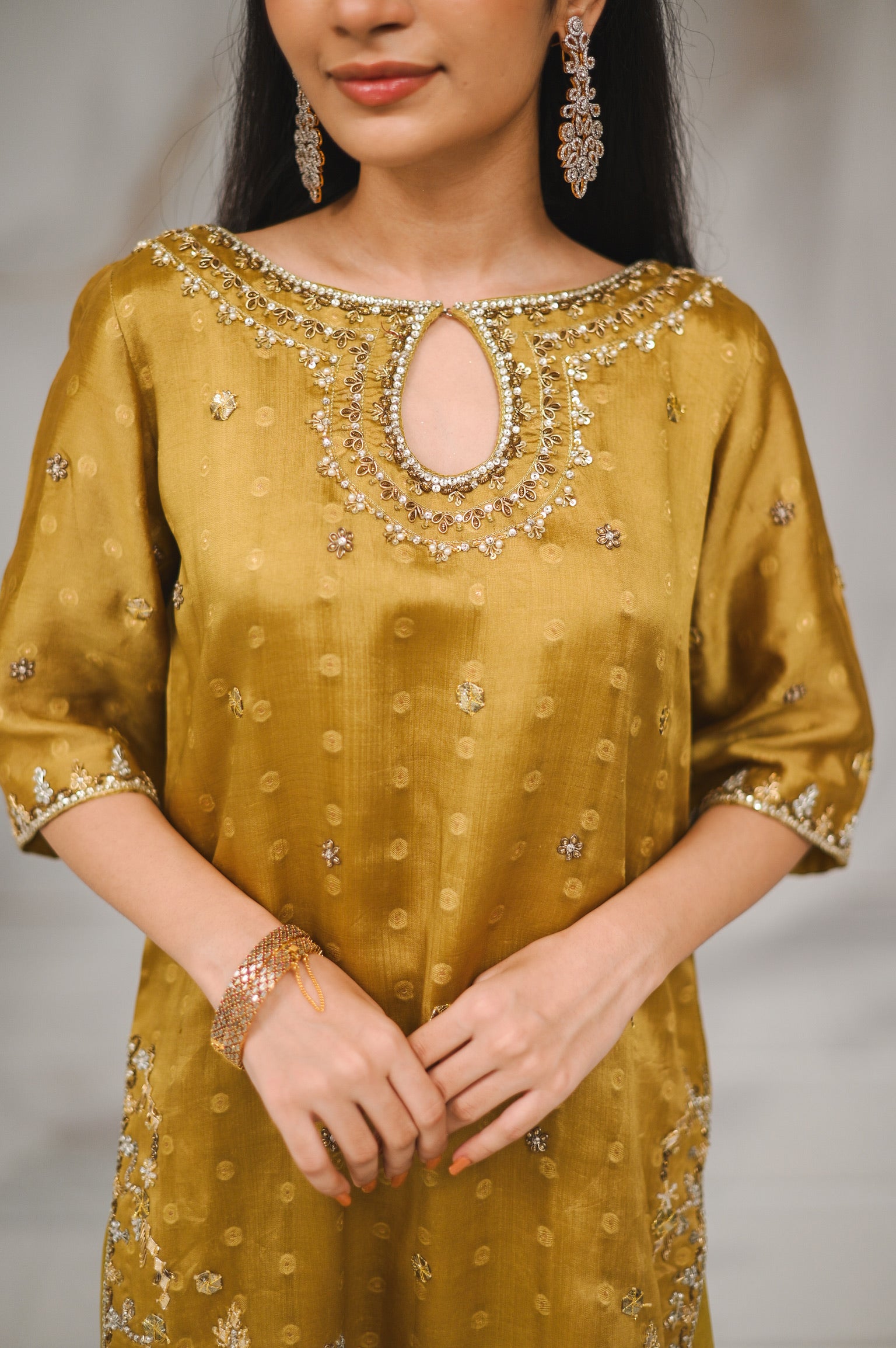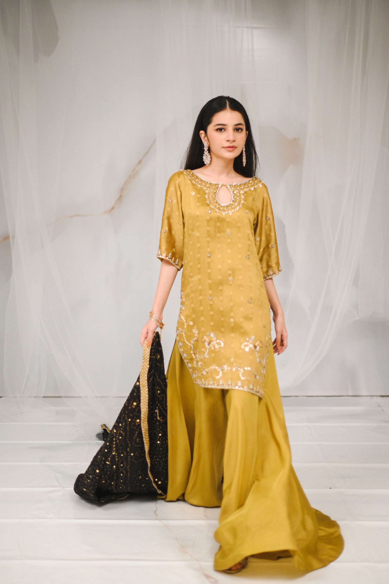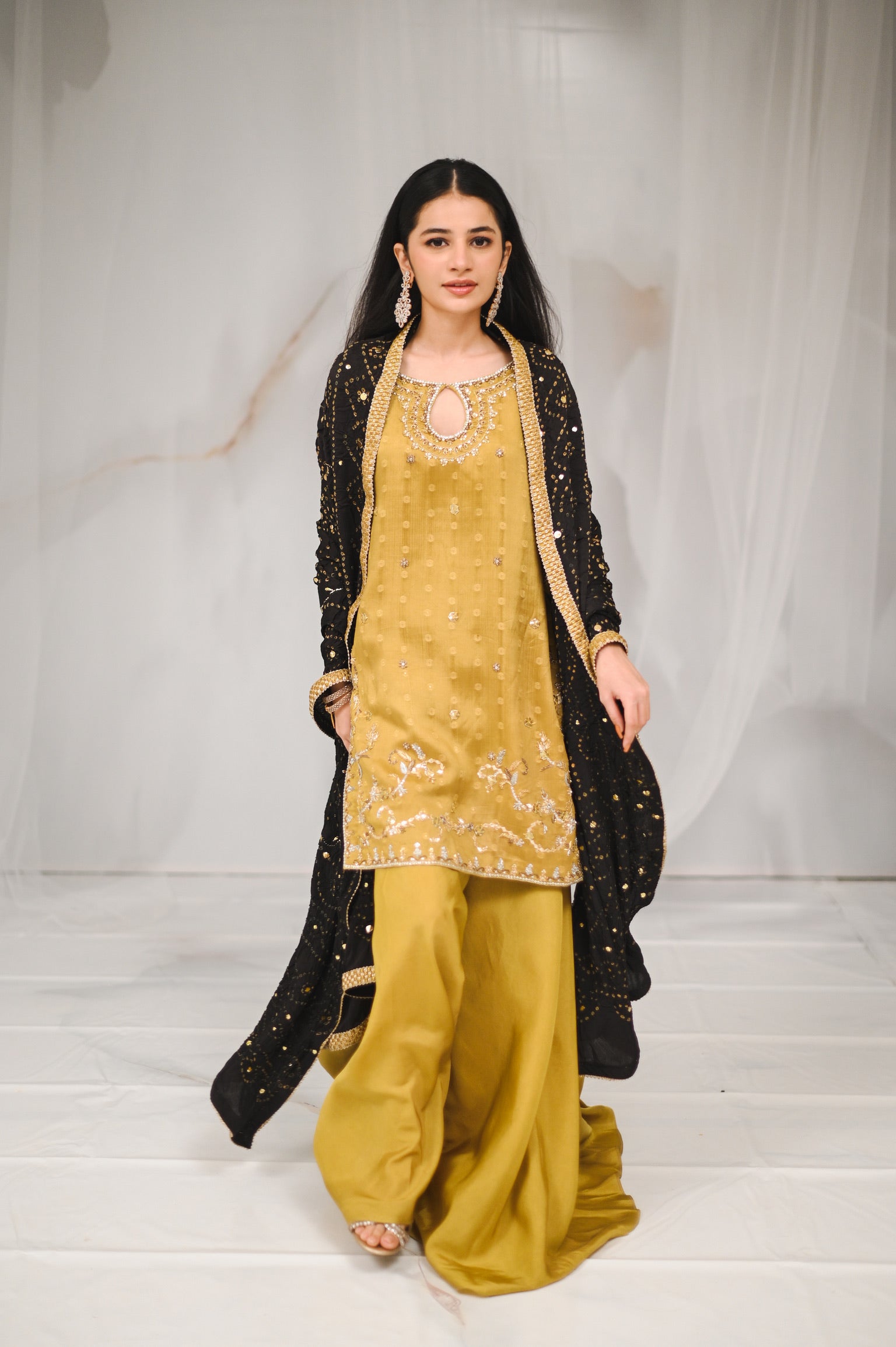 Elevate your formal wardrobe with our exquisite Eastern Pakistani ensemble, featuring a stunning yellow mustard shirt paired with matching Dhaka pants. Adorned with intricate handwork, including sequins, kora, dabka, and Gota, this outfit radiates elegance and tradition. Complete your look with a luxurious black Chunri Dupatta embellished with Kamdani for a touch of sophistication. Perfect for weddings and special occasions, this handcrafted attire not only showcases your unique style but also supports traditional artisans. Shop now to embrace the essence of Eastern elegance!